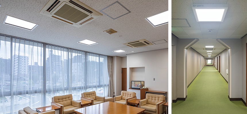 議場棟の議員控室や廊下にはスクエアタイプのLEDベースライトをご採用。