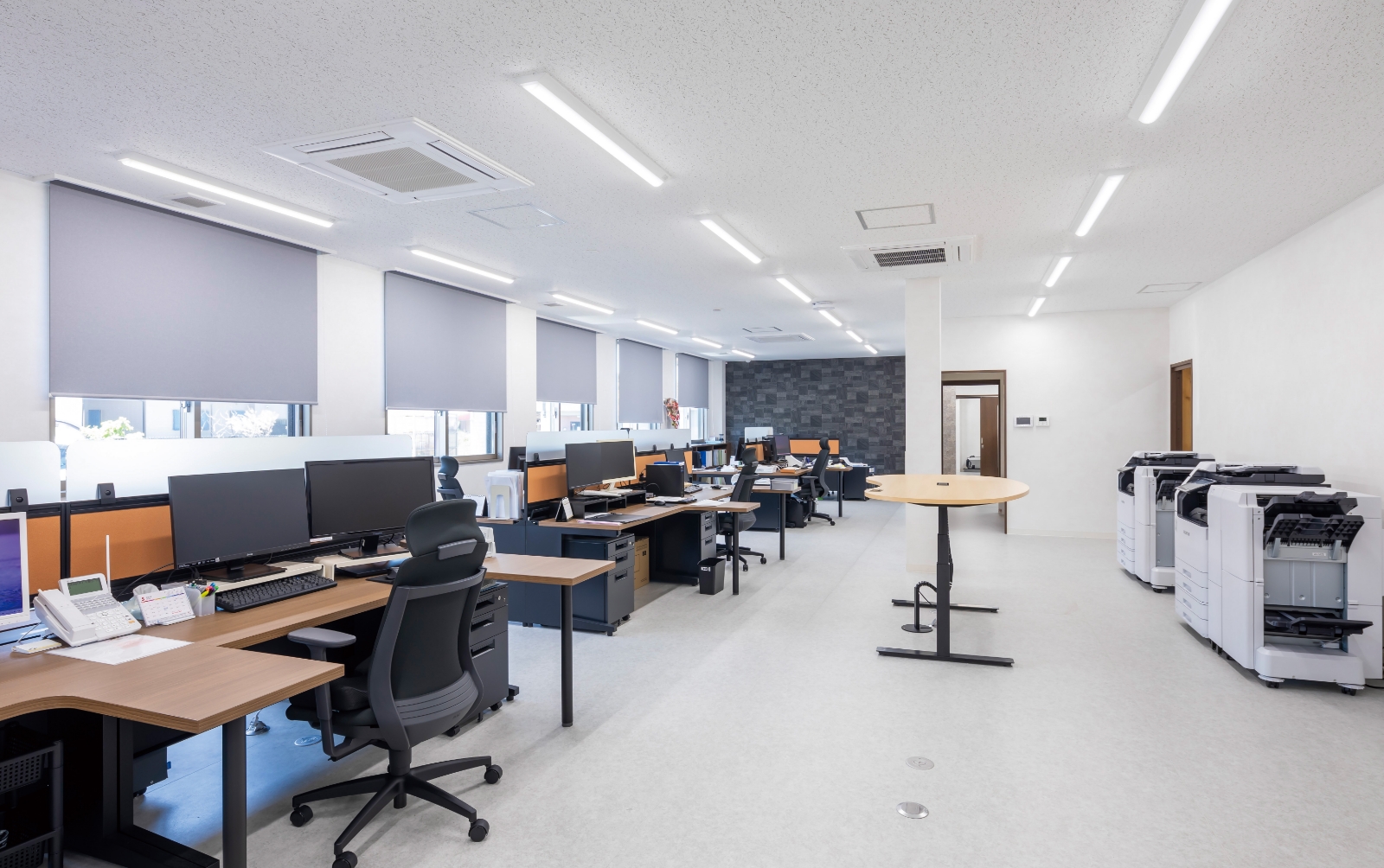 『ZEB』設計の主なポイントとしては、①空調設備に太陽光発電からの電力を無駄なく利用するため単相のパッケージエアコンを採用されたこと、②全熱交換器により室内の温度ムラの低減を図ったこと、③執務室には明るさセンサ、トイレ・倉庫などのバックヤードにはひとセンサを採用するなどLED照明の消費電力を効率よく低減されたこと、などがあげられます。「新社屋に引っ越してきてから数か月のため、省エネ効果を実感するのは少し先になりそうですが、暑すぎず寒すぎずの空気環境の快適さは日々実感しています。とりわけ熱交換気システムのよさを肌で感じます。ZEBにして本当によかったです」と松尾様。