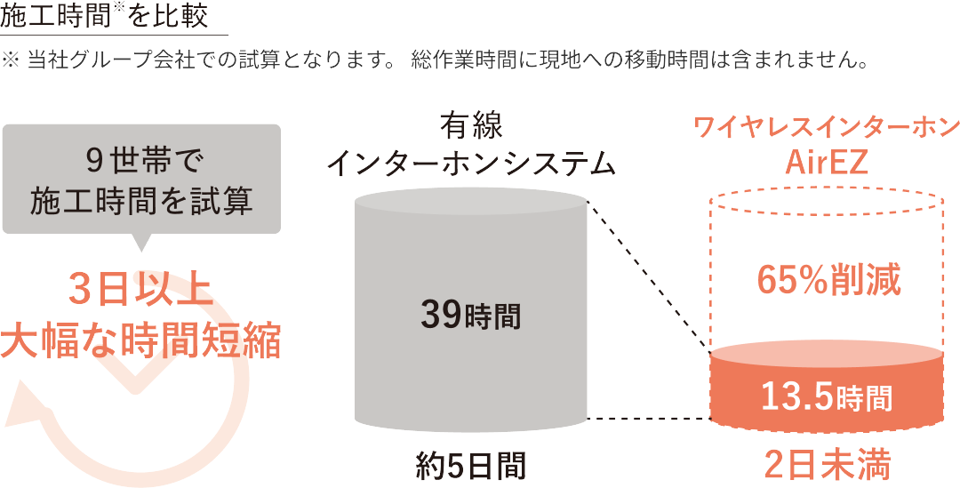 全住戸に対して無線通信(ワイヤレス)で接続のため、インターホン親機への新規配線が不要になり、省施工を実現。