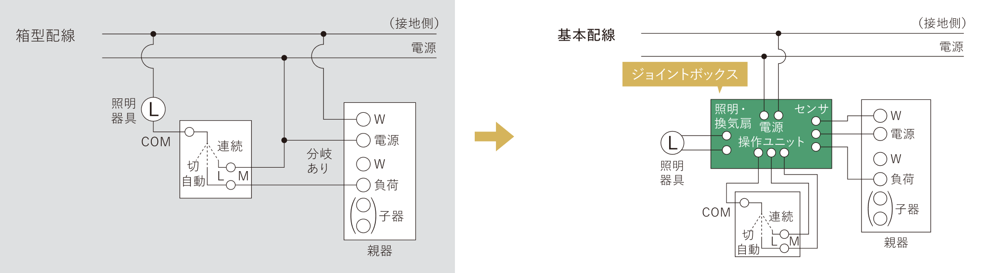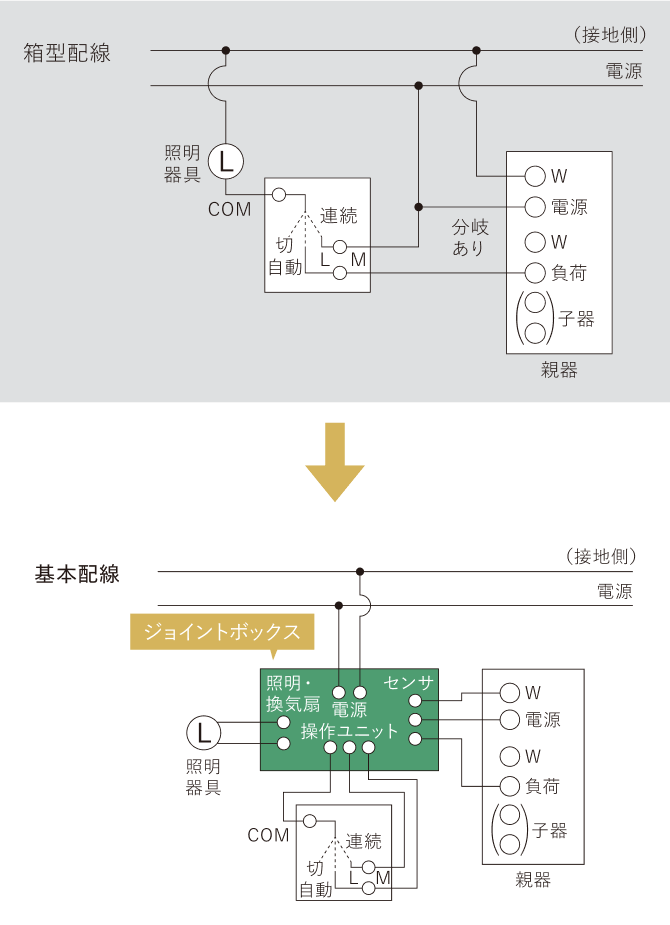 センサと操作ユニット組み合わせ時のジョイントボックス内の複雑な結線を電線直結だけで施工完結でき、省設計・省施工を実現します。