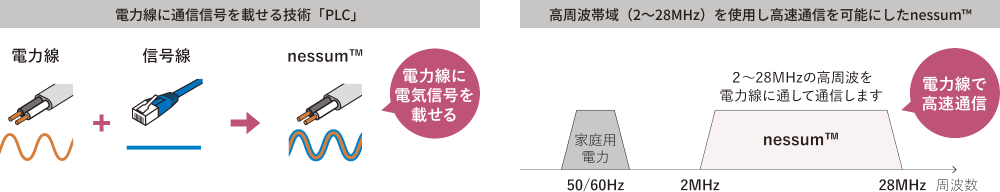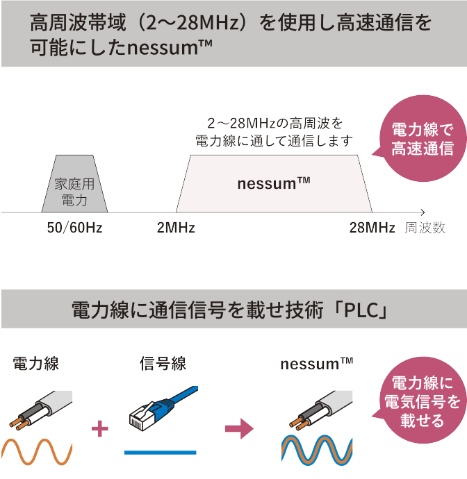 nessum™対応PLCアダプターは、既存の電力線を利用してデータ通信ができるため、通信専用線の敷設や無線通信が困難な場面でのネットワーク構築がかんたんです。また、従来の家庭用電力や従来のPLCに比べ、高周波帯域(2~28MHz)を使用することで高速通信も可能になりました。