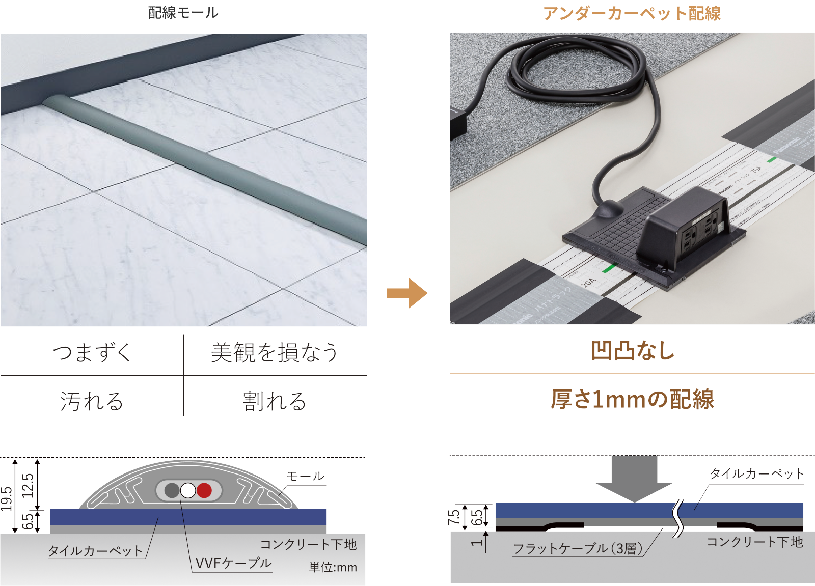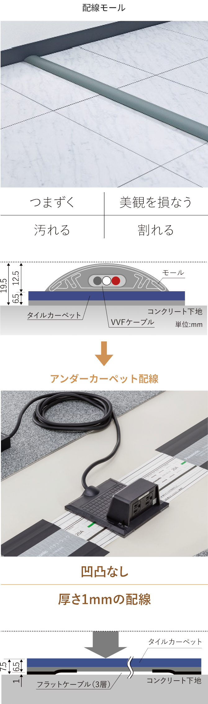 厚さ1mmの電源ケーブル(フラットケーブル)をタイルカーペットや置敷ビニルタイルの下に敷くだけで簡単に電源の設置が可能。