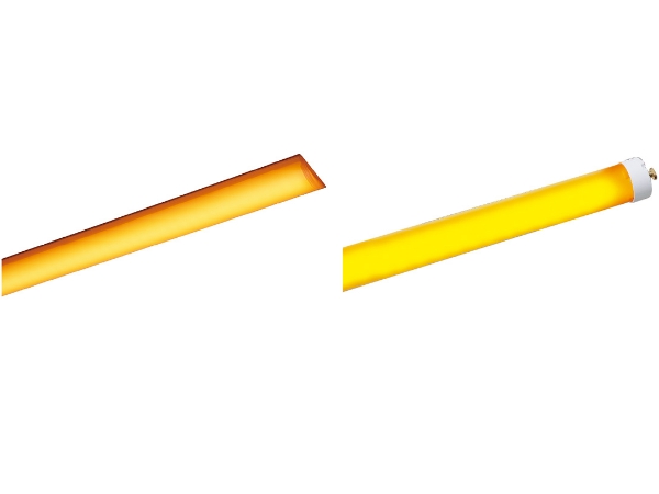 黄色の着色バルブに単色光の蛍光物質を塗布した黄色光の蛍光灯。