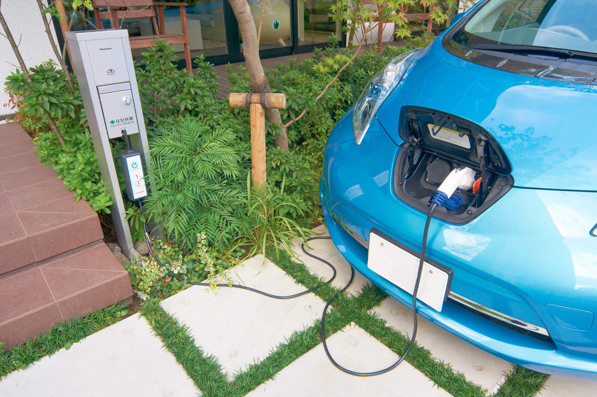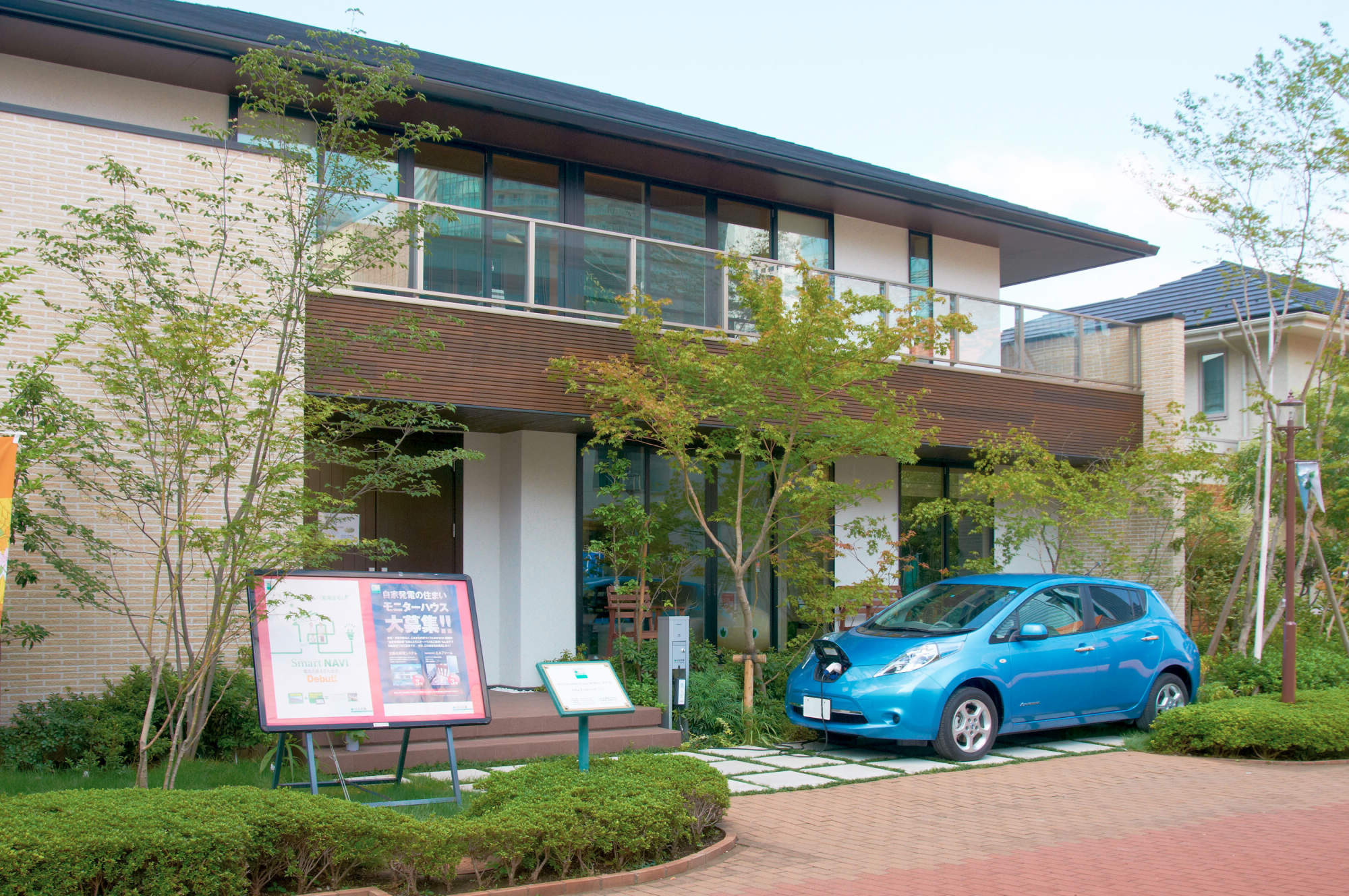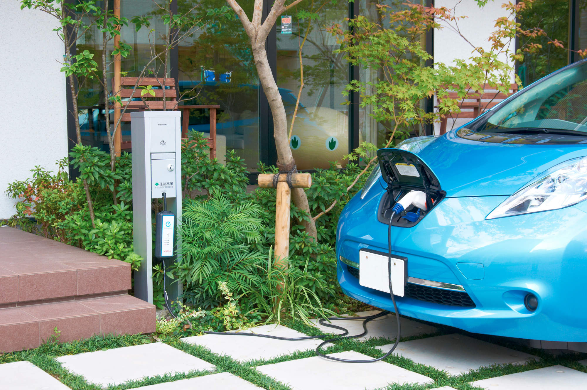 最先端テクノロジーを駆使した、みらい世代の住まい、木のぬくもり漂う空間に、さまざまな生活提案も満載のモデルホームに、電気自動車(EV)やプラグインハイブリッド車(PHEV)の充電できる充電スタンド「ELSEEV mine(エルシーヴマイン)」をご採用、エコカーによるクリーンなクルマ社会への貢献を提案されています。