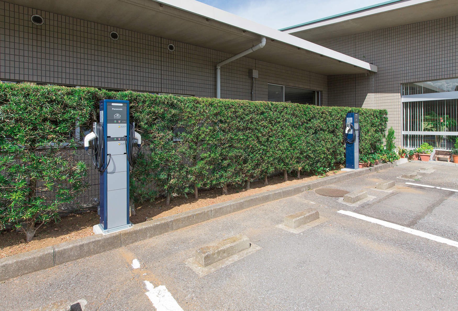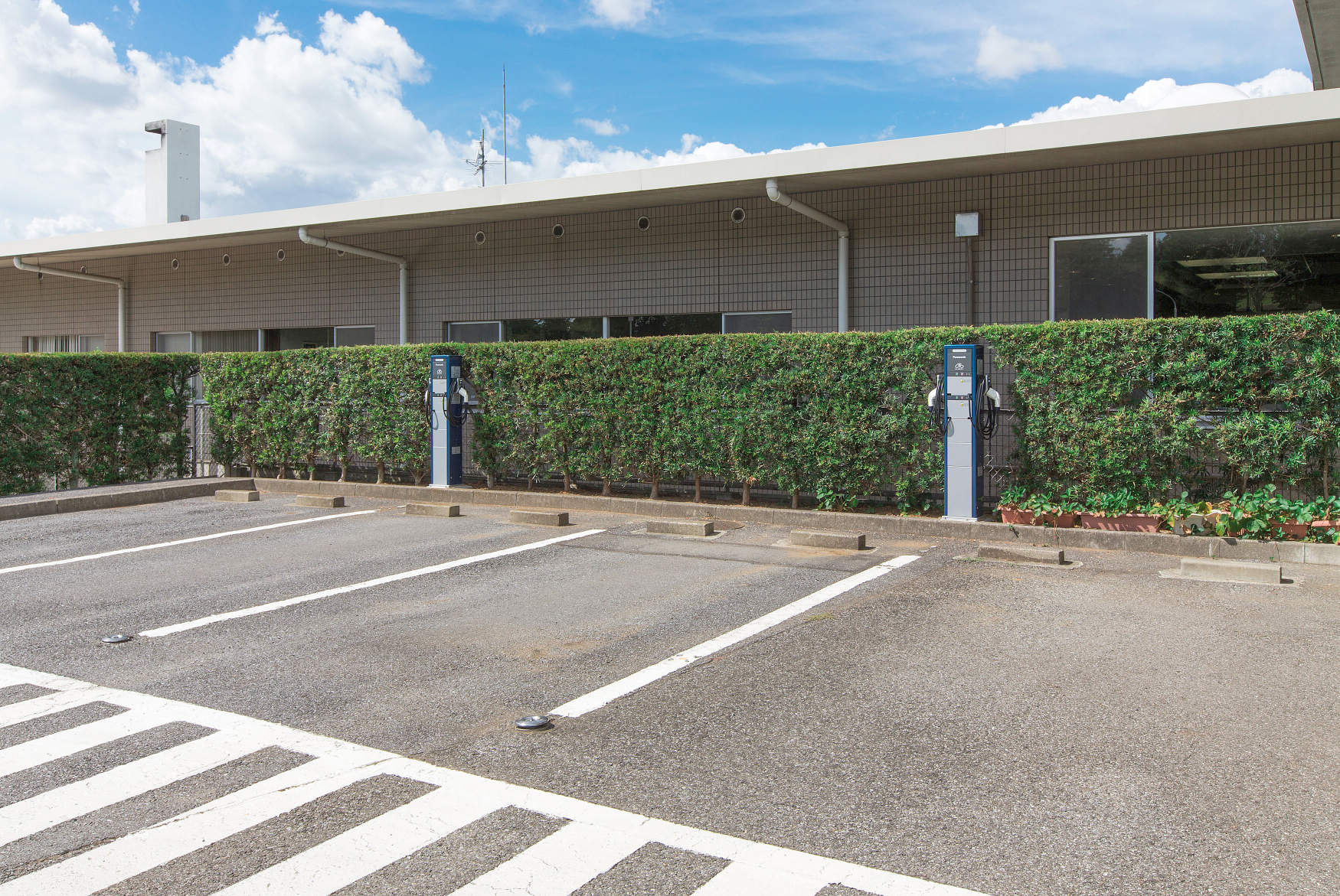 クラブハウス横の駐車場に設置された電気自動車充電スタンド「ELSEEV(エルシーヴ)」。