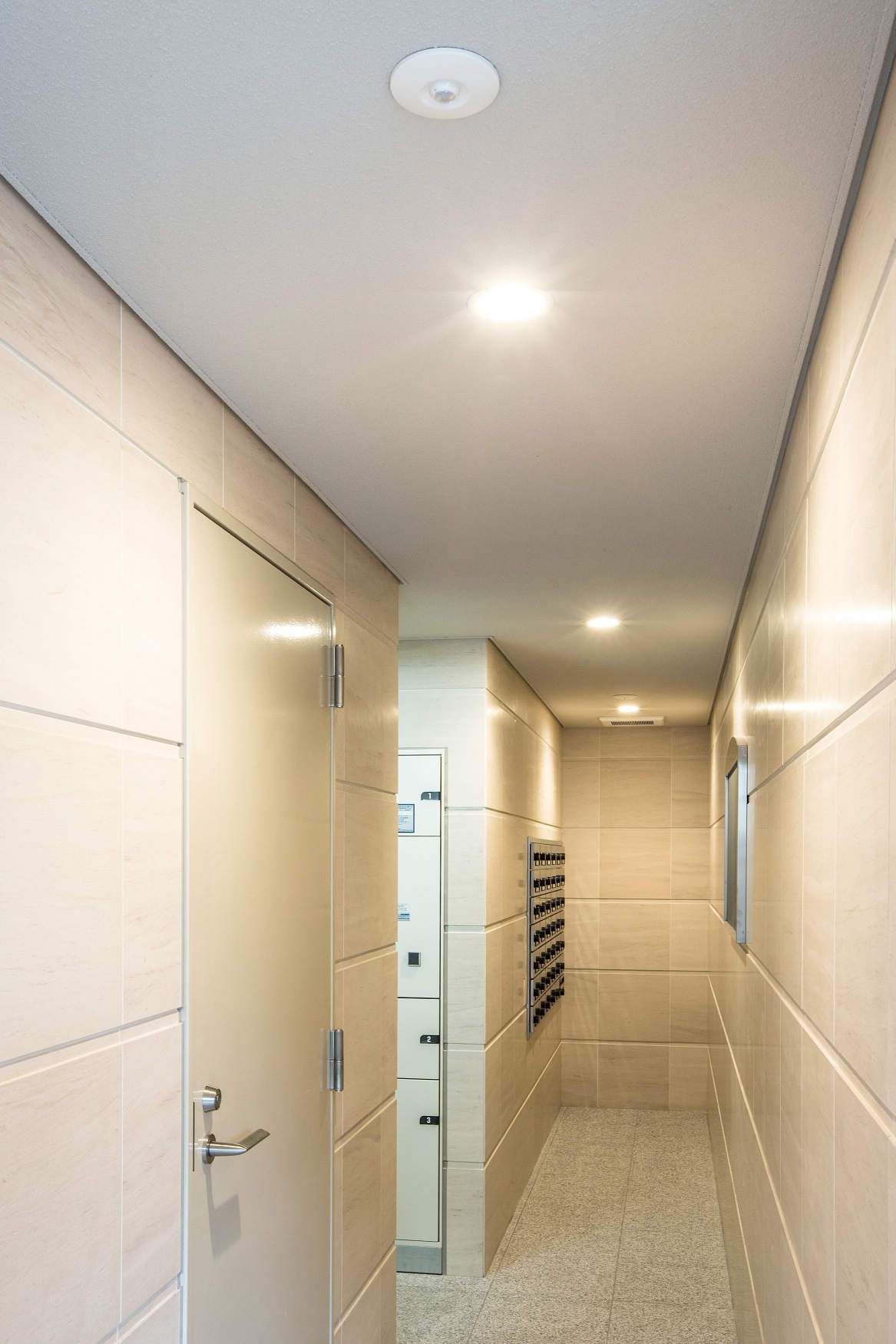 共用部メールコーナーのダウンライトには「天井取付熱線センサ付自動スイッチ」を設置。