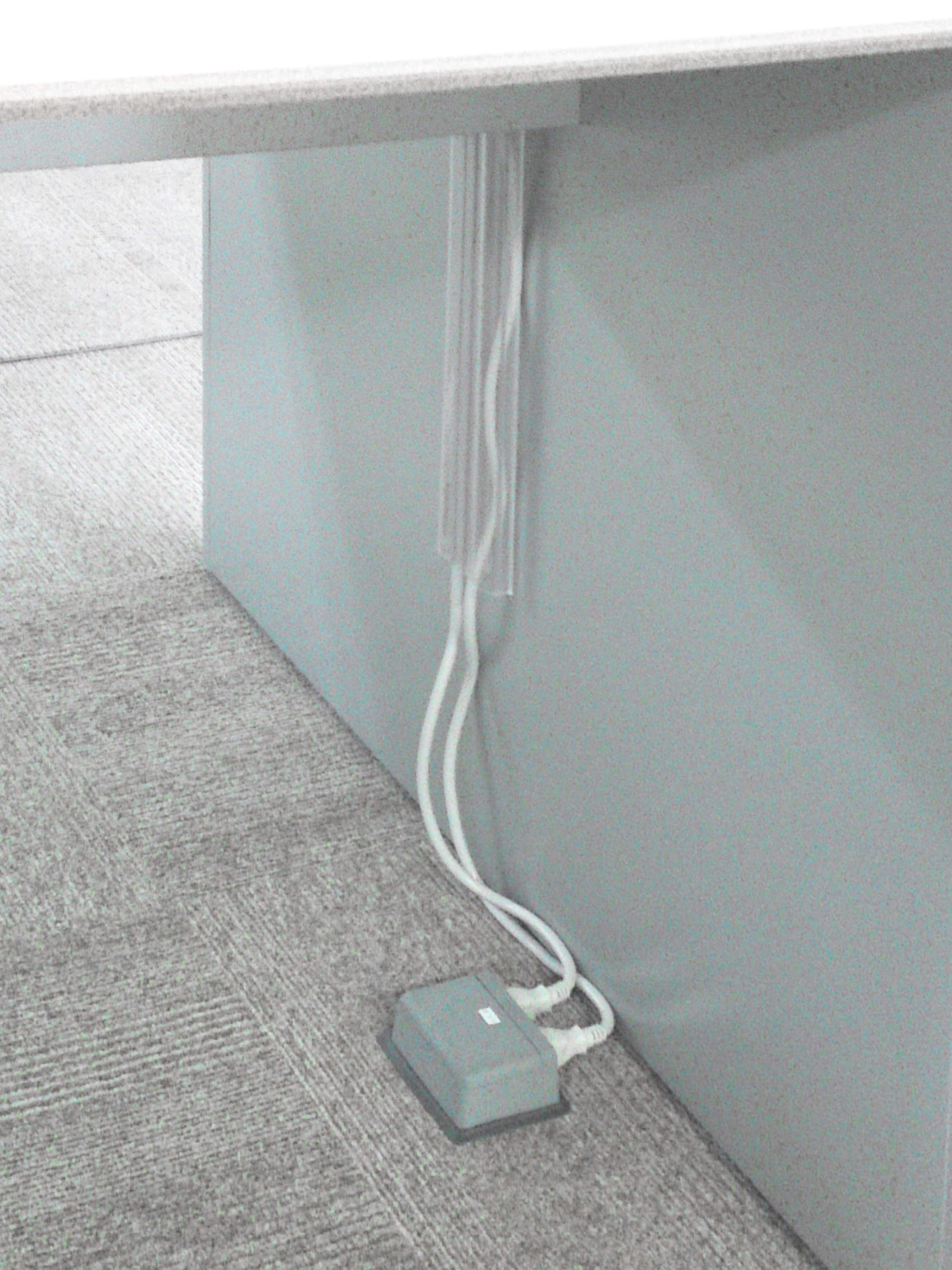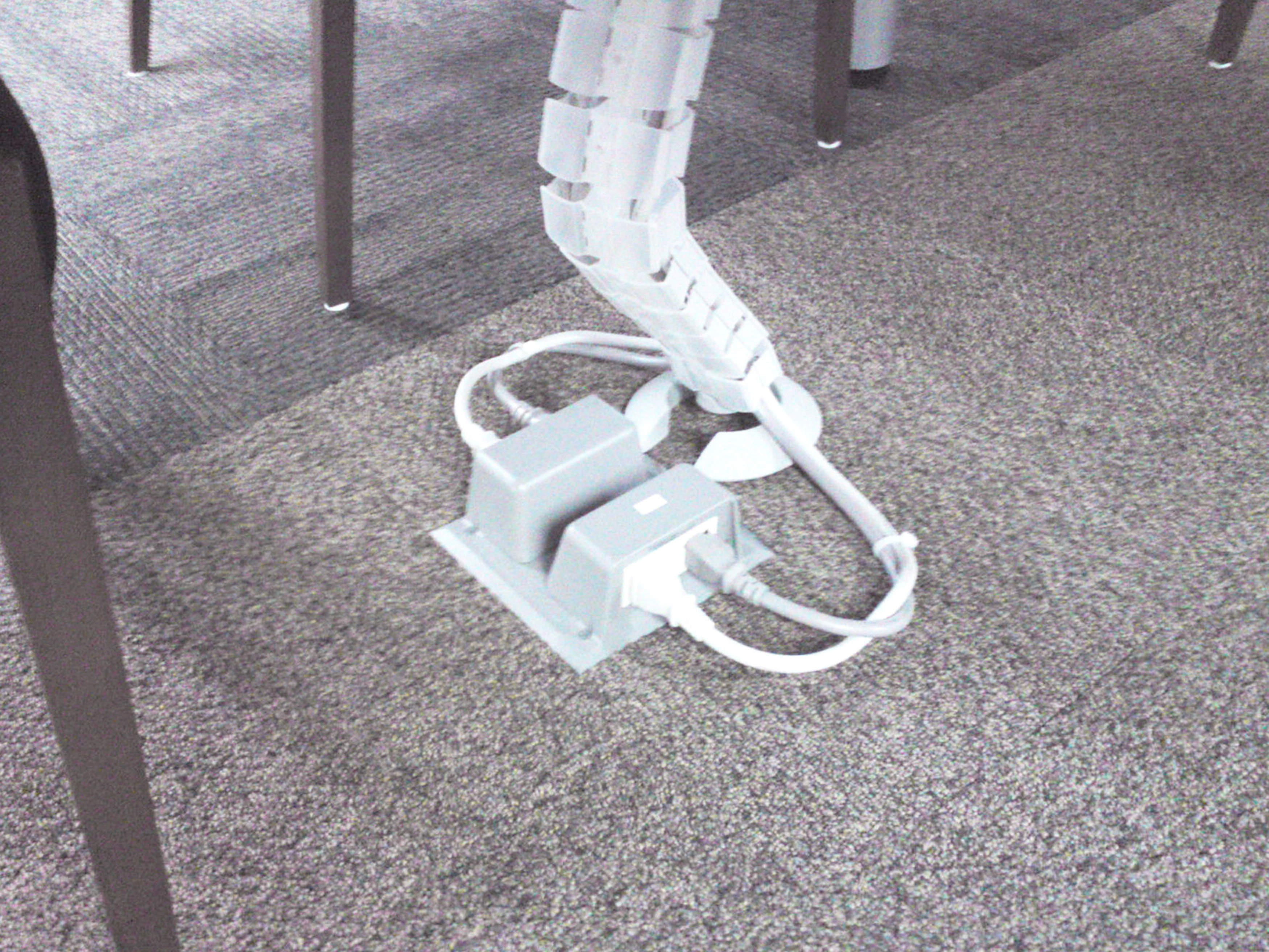 厚さ1mmのアンダーカーペット配線「パナトラック」をタイルカーペットの下に敷設し(写真中央下)、脚元のコンセントに配線しています。