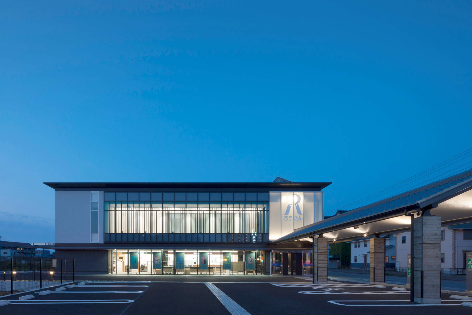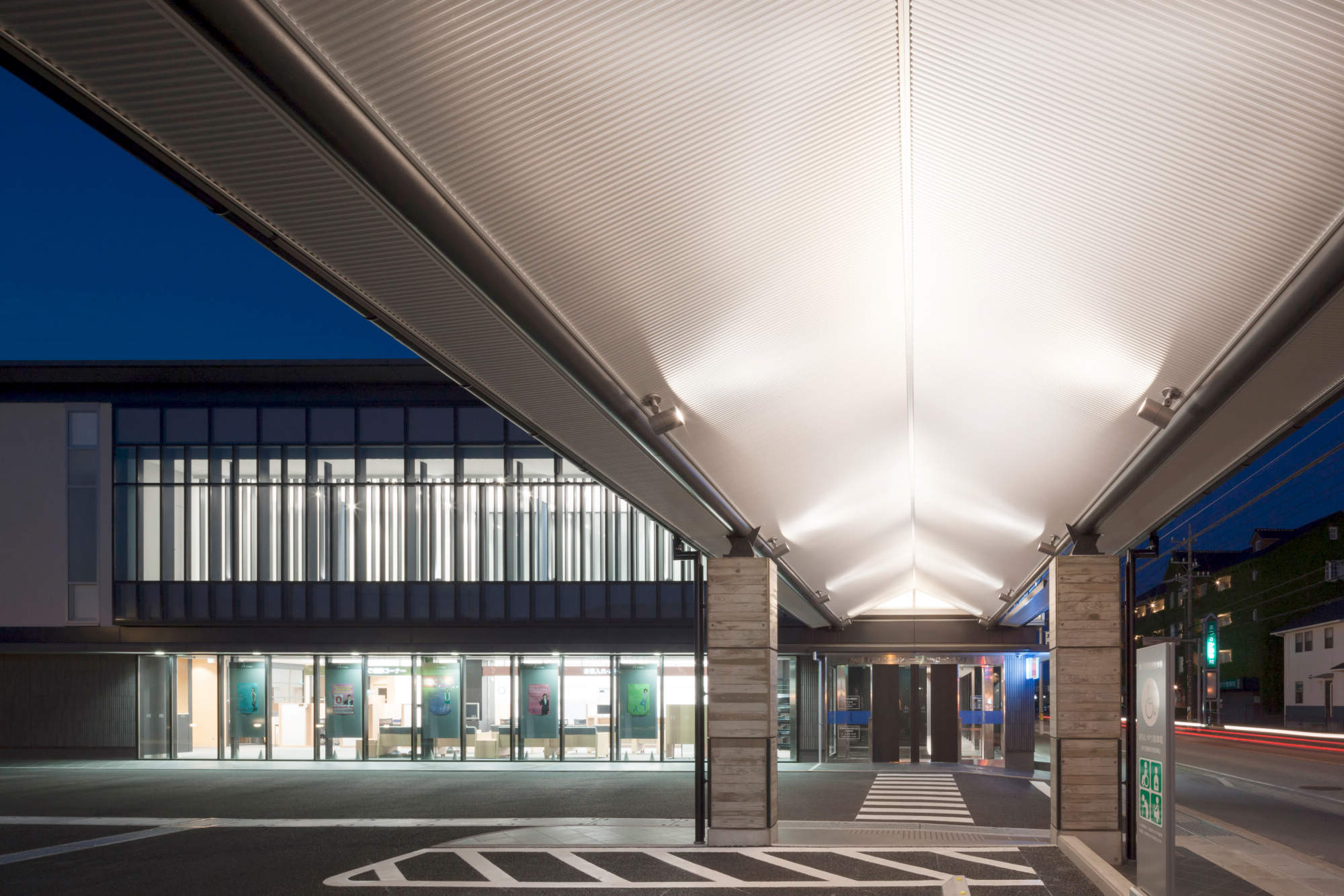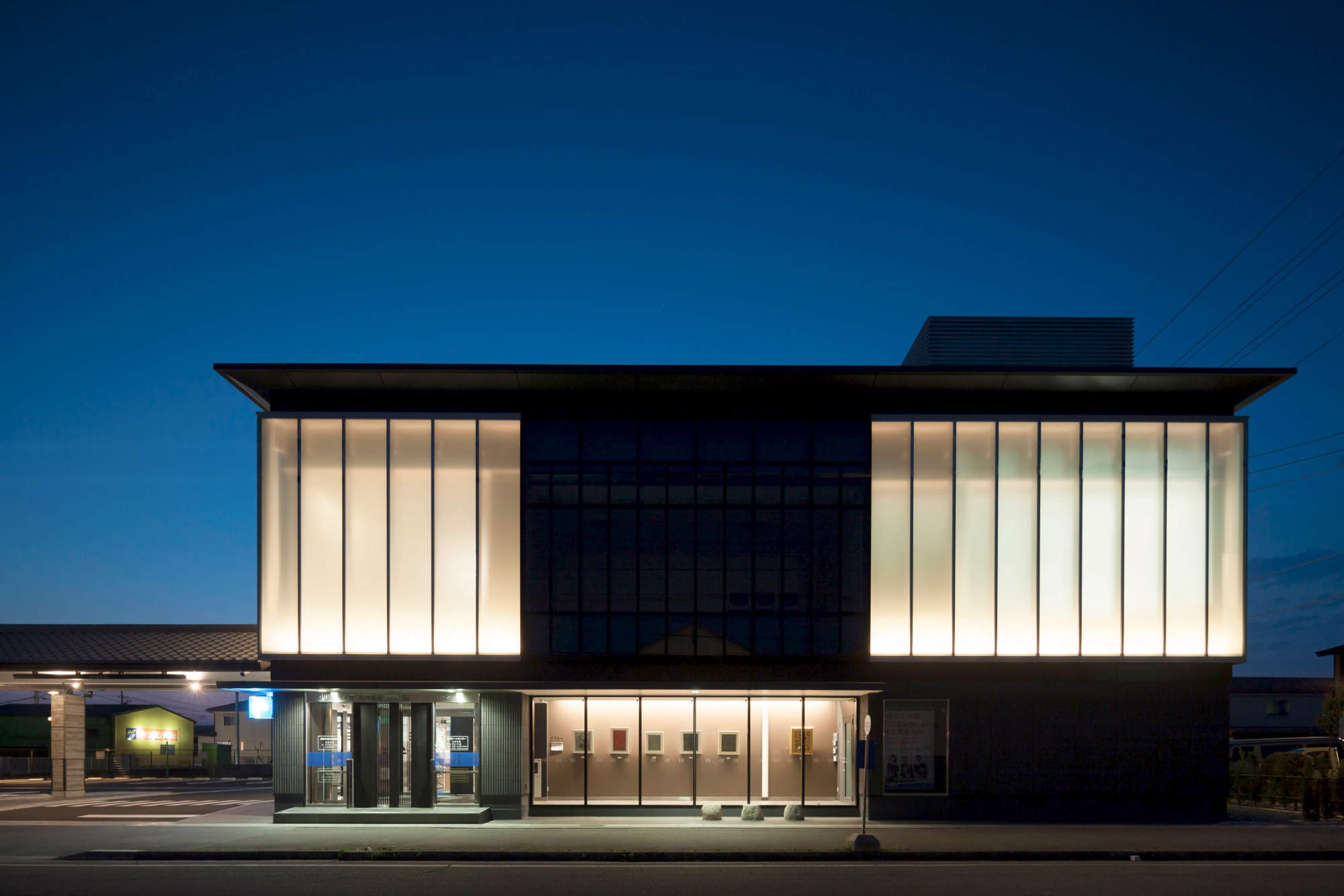 江戸時代に栄えた宿場町らしい風情を反映した外観。2階外壁に配された光壁は、透過ガラスと半透過ガラスの切り替えにより建物の奥行きと立体感を強調しました。和風の外観が際立ち、松阪らしい透明感のある佇いをつくりあげています。