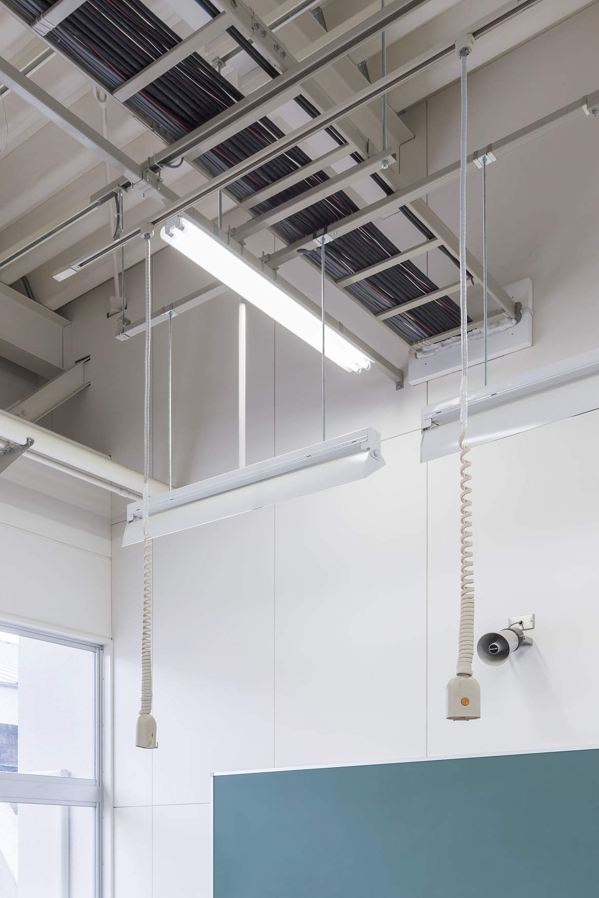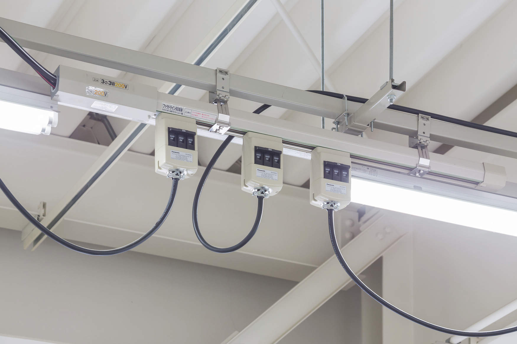 教職員や学生の方が行き交う各教室で、床面配線を避けるため、天井から自由に電源が取り出せるファクトラインをご採用いただきました。