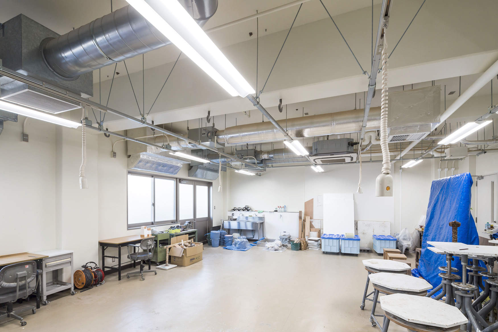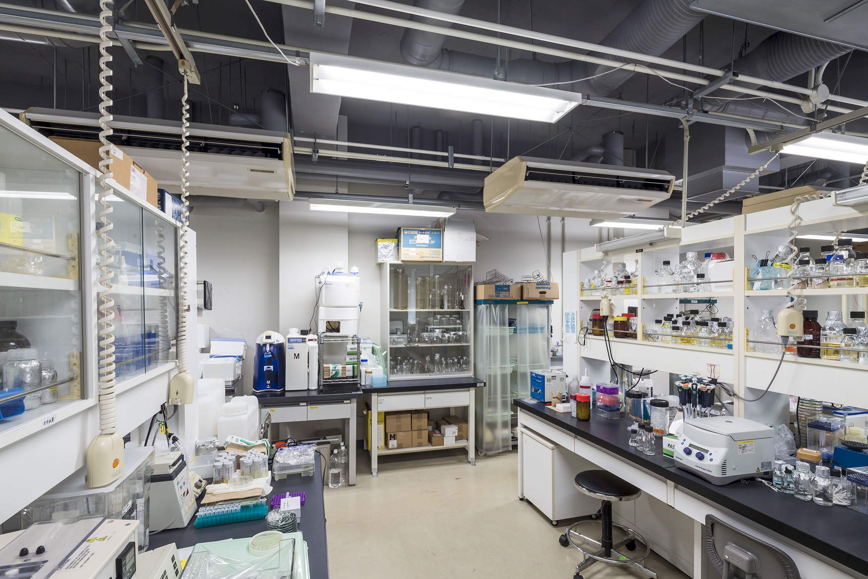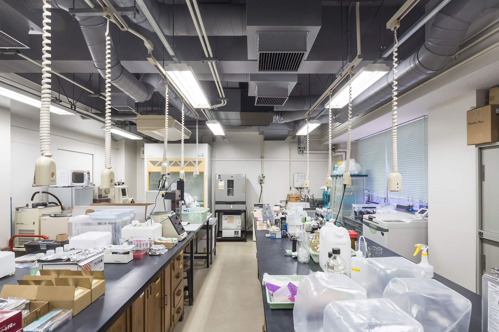 実験室での安全・安心への配慮から、床面配線を避けるために天井用配線ダクト「ファクトライン」を採用されました。