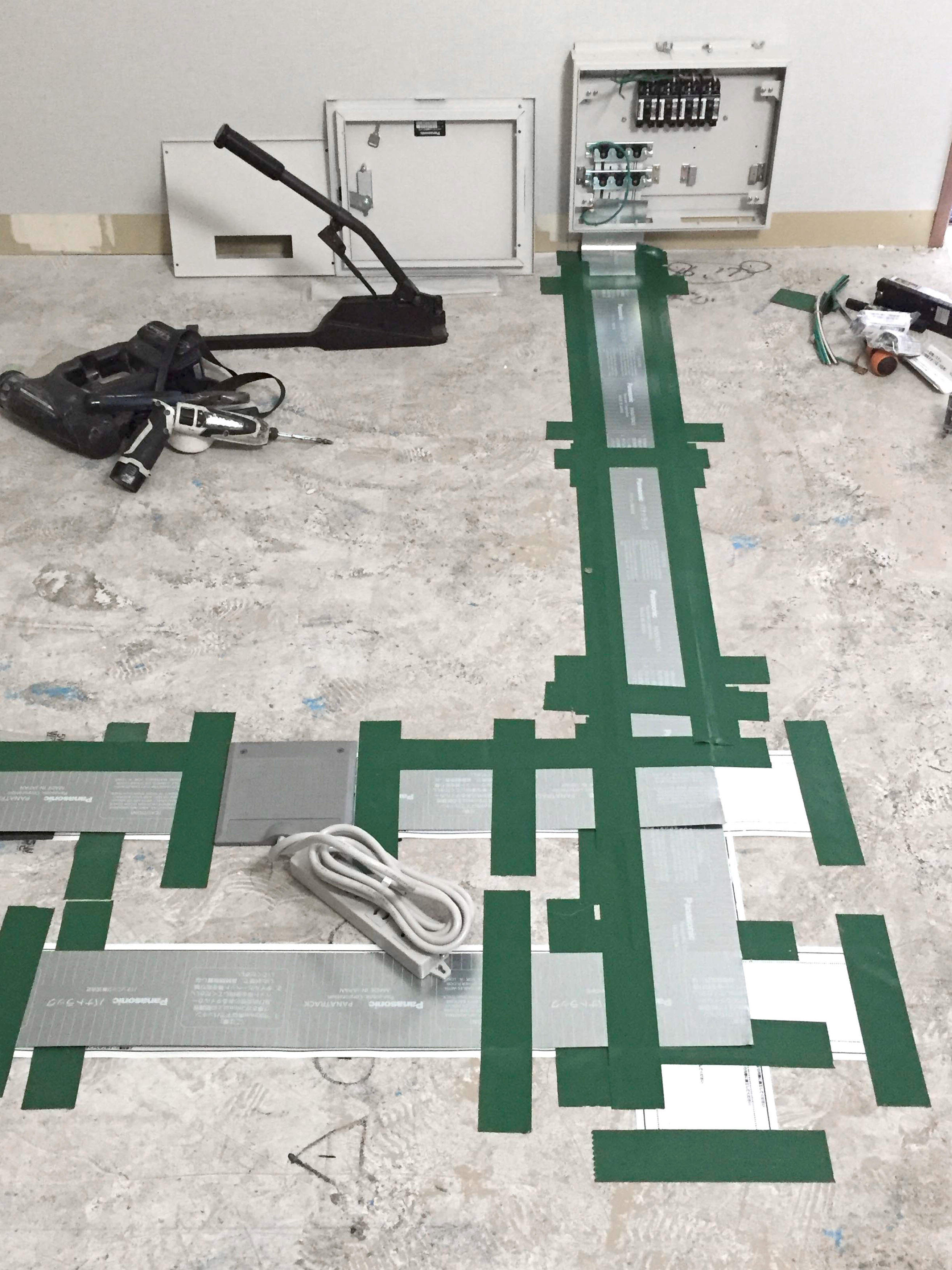 「パナトラック」は厚さ1mmの電力ケーブルをタイルカーペットの下に敷設することで配線できます。