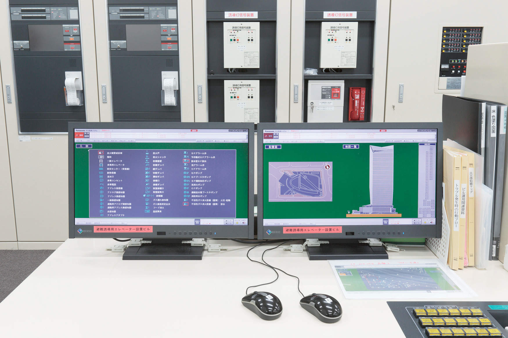 また、FRコントローラによるバックアップにより、受信機がダウンした場合でも、防災センター及び36階管理事務室のセンター表示装置で防災監視を継続して確認でき、施設の安全を支えています。