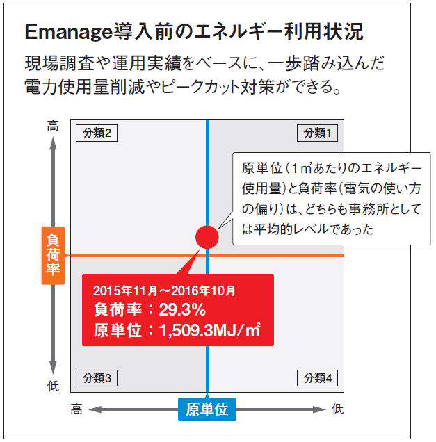結果、エネルギー使用量と電気の使い方は、どちらも事務所として平均的レベルでした。