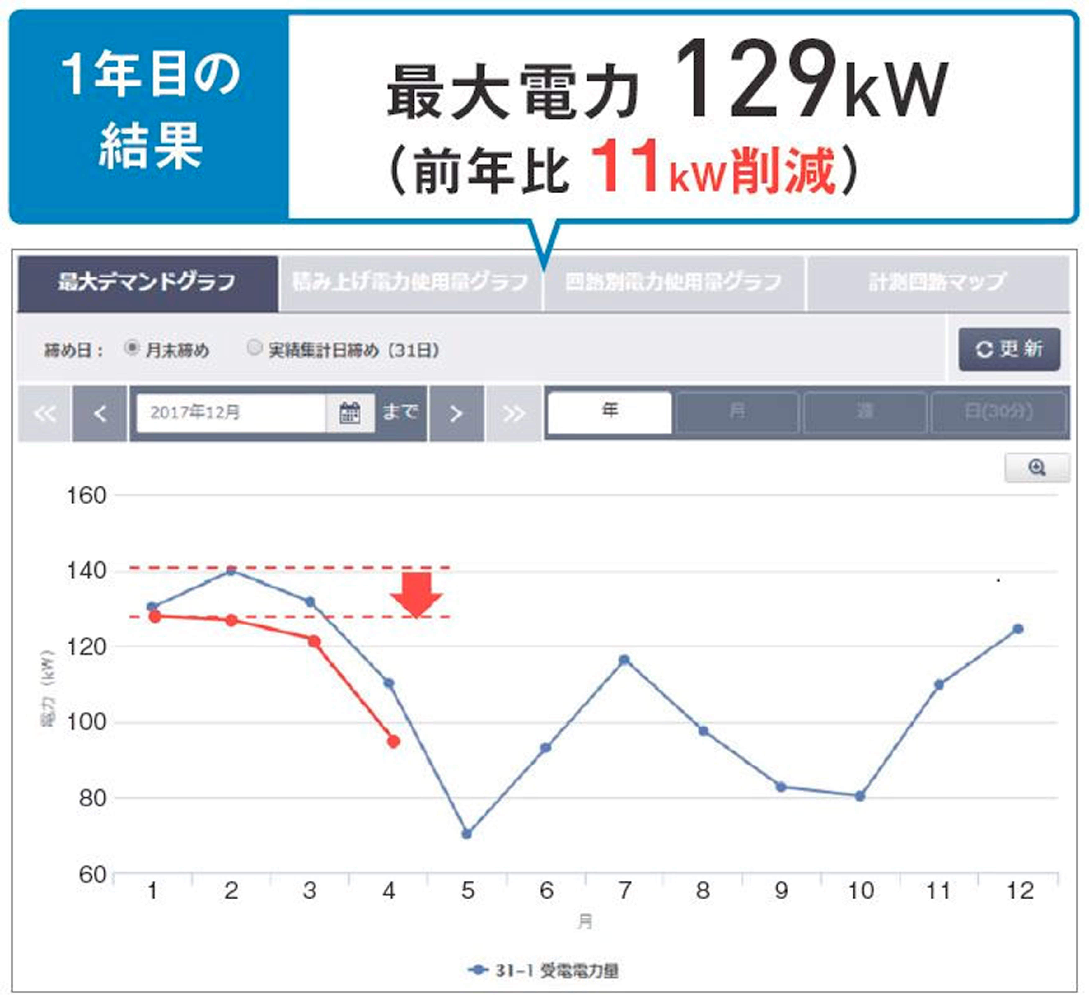 空調運用改善で最大電力を前年比11kW削減、基本料金は25万円/年削減できました。