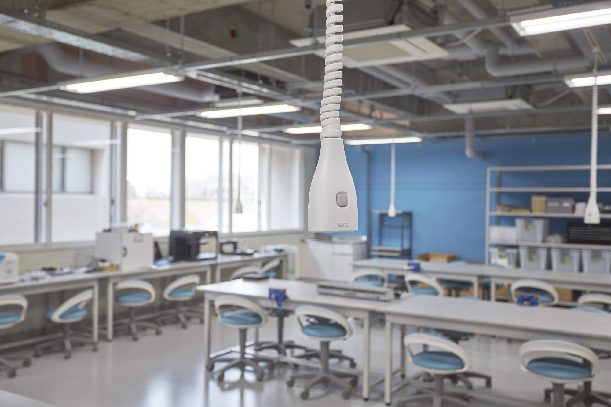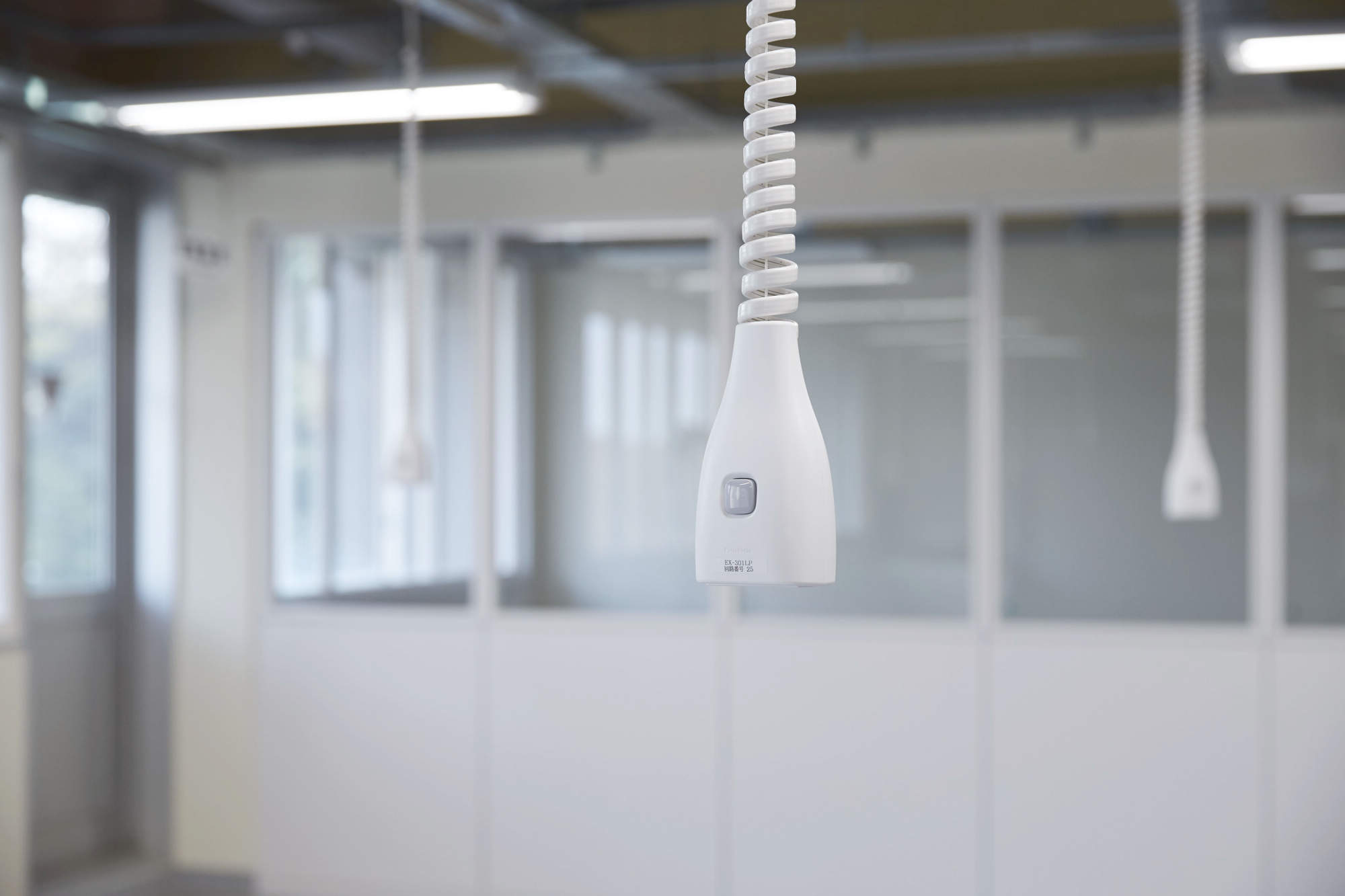 天井から給電することで床に配線がなく、コードにつまづく心配をせず作業に集中することができます。