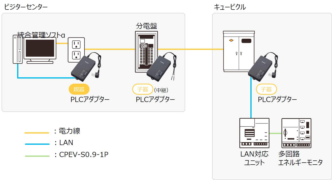 事務所のPLCアダプターと、キュービクル側面のPLCアダプターとの2台では届きにくかった計測データも、経路途中の分電盤に中継用の子器を設置することで、安定してデータを送信することができます。