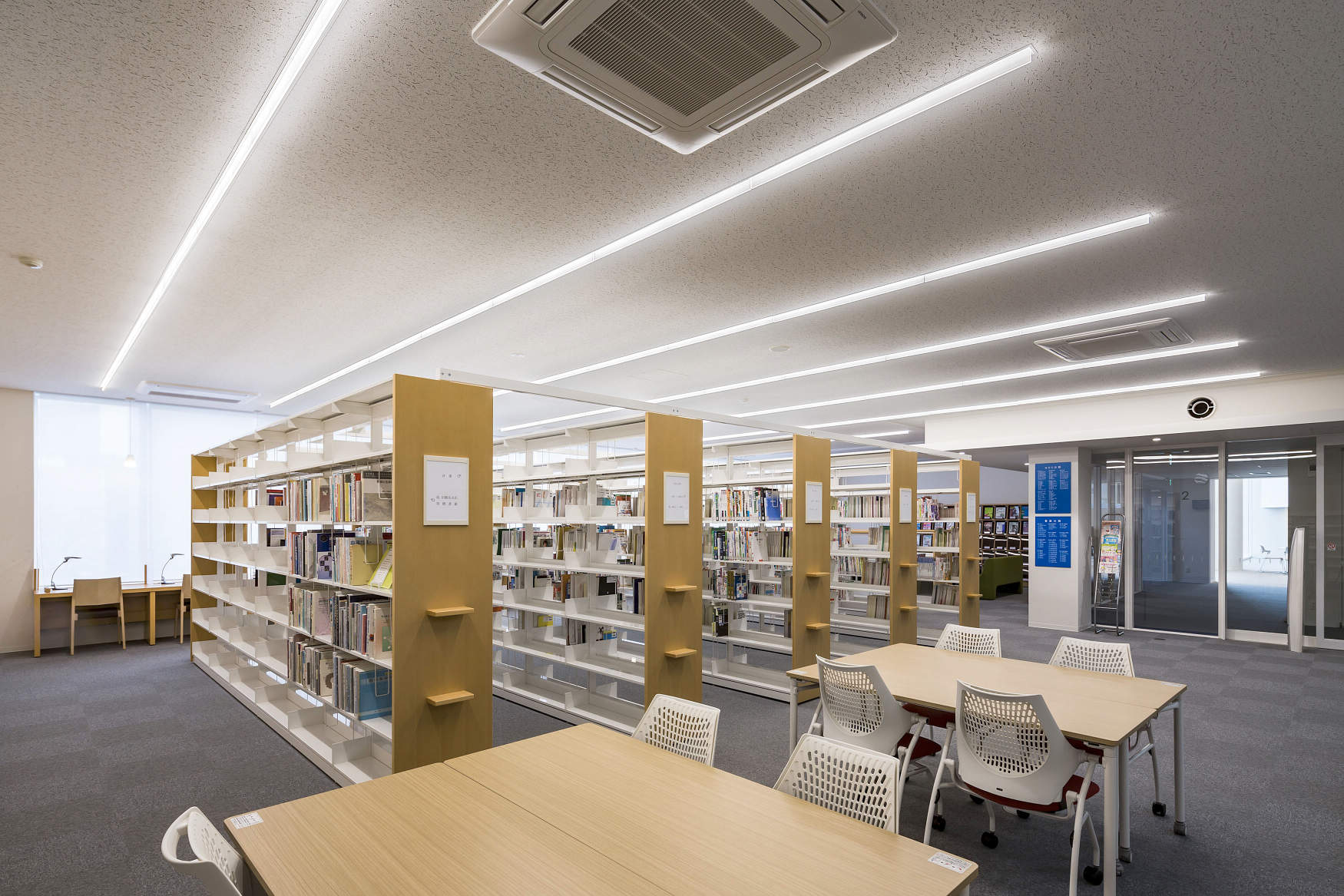 図書室ではLED 照明の特性を活かした意匠的なベースライトを採用しています。半埋込タイプで天井から飛び出した導光板は、最新の配光制御技術により床・机上面だけでなく天井面にも光を届け空間の明るさ感をアップさせています。