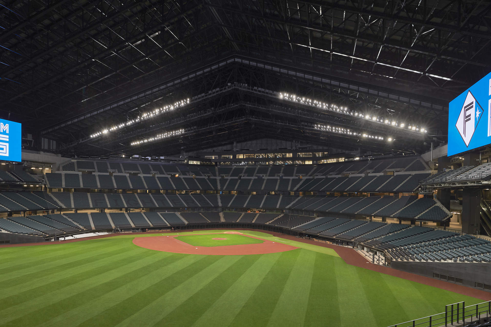 メインとなるフィールドは、LED投光器354台にてプロ野球公式試合にふさわしい照度を確保しながら選手の眩しさに配慮した「プレイヤーファースト」な照明環境となっています。可動式の屋根や世界最大級のビジョンを持つな唯一無二の複雑な建築により、照明器具設置位置に大きな制約があるなか、VRにて事前にシミュレーションし、適切な照明配置とエーミングを実現しています。