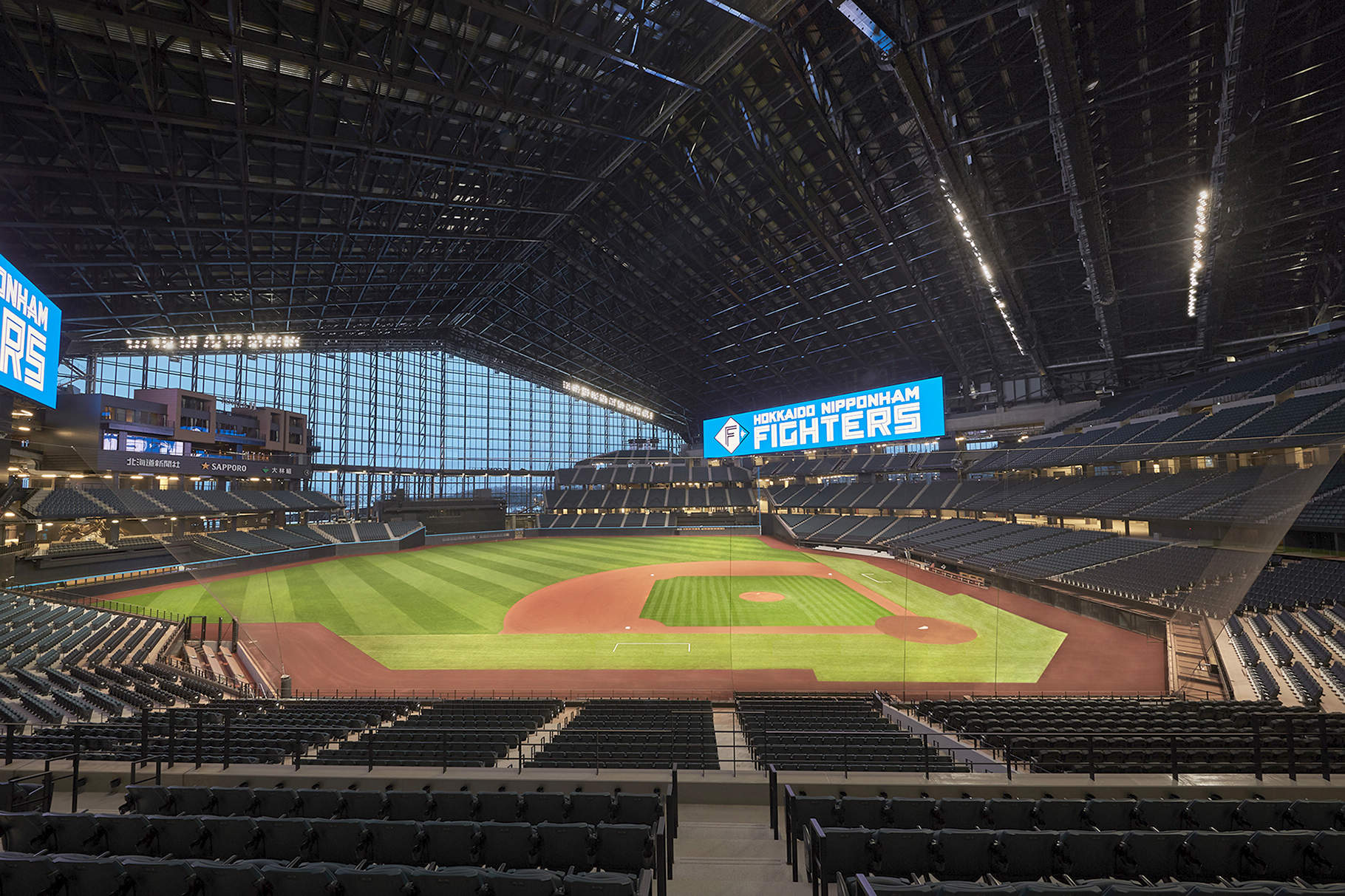 - 北海道北広島市Fビレッジに建設された北海道日本ハムファイターズの本拠地となる球場。敷地面接5ha、収容人数3万5000人の日本初開閉式屋根付き天然芝球場となっています。建物は道民に馴染のある切妻屋根が特徴的なデザインで、外壁はレンガ調タイルを採用し、北海道のシンボルを目指しています。天然芝を育てるために、PCライン(ピッチャーキャッチャー)の向きを南東向きとし、大きなガラスカーテンウォールから直射日光を取り込める仕様となっています。また、大きな屋根の1枚が水平に開閉することで、屋外環境にもなり、天然芝育成のための光・風環境の向上、および多様な観戦環境の提供に寄与しています。フィールドに面したレフト側には、温浴施設(温泉・サウナ)・ホテル、ライト側にはビールの醸造所・キッズスペースがあり、試合がない日にも人々が集うことができる機能も有しています。