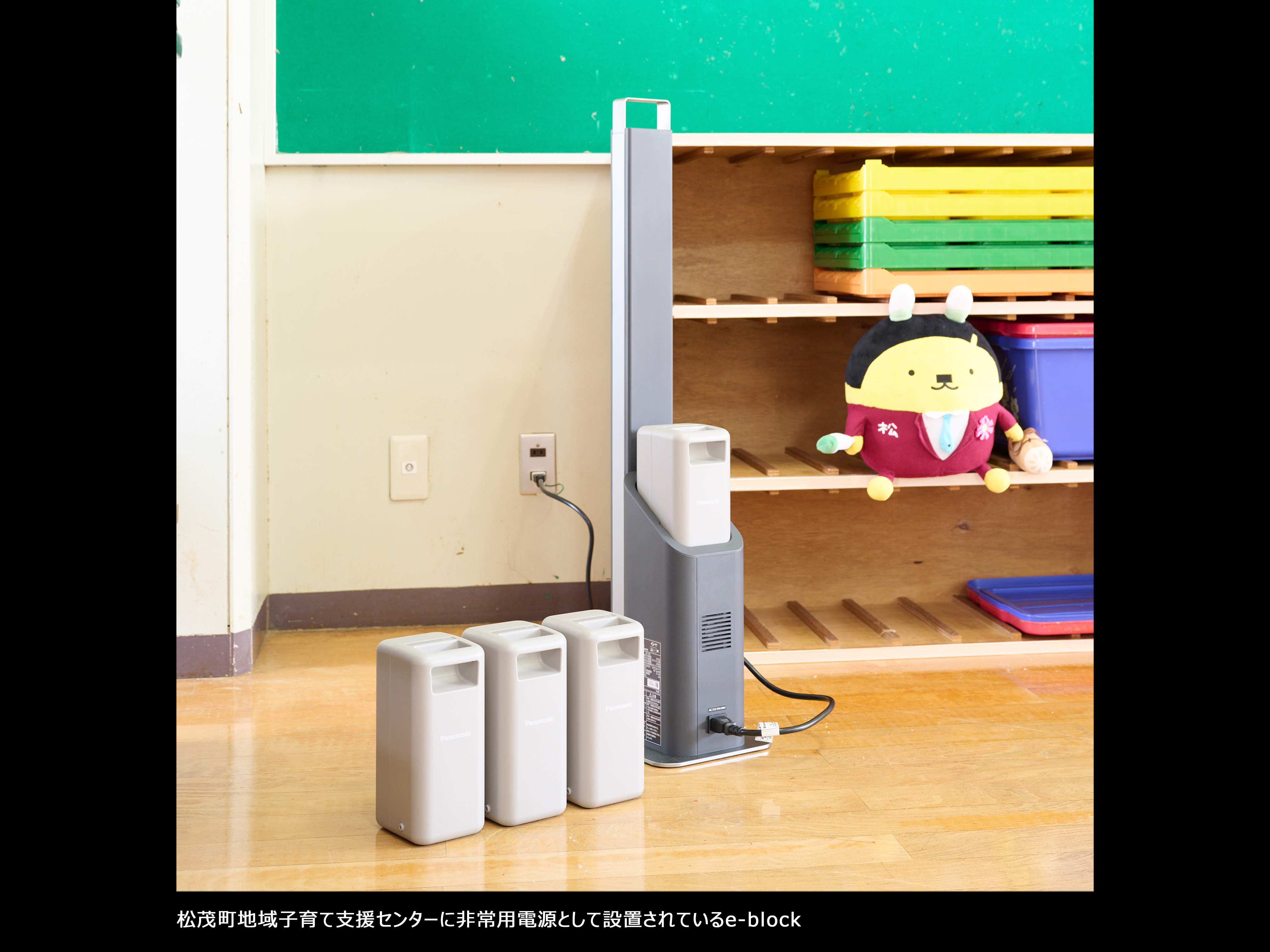 女性でも持ち運べる軽さが魅力のe-block。災害時の地域住民のスマートフォン用電源供給に、e-blockを避難施設へご採用されました。