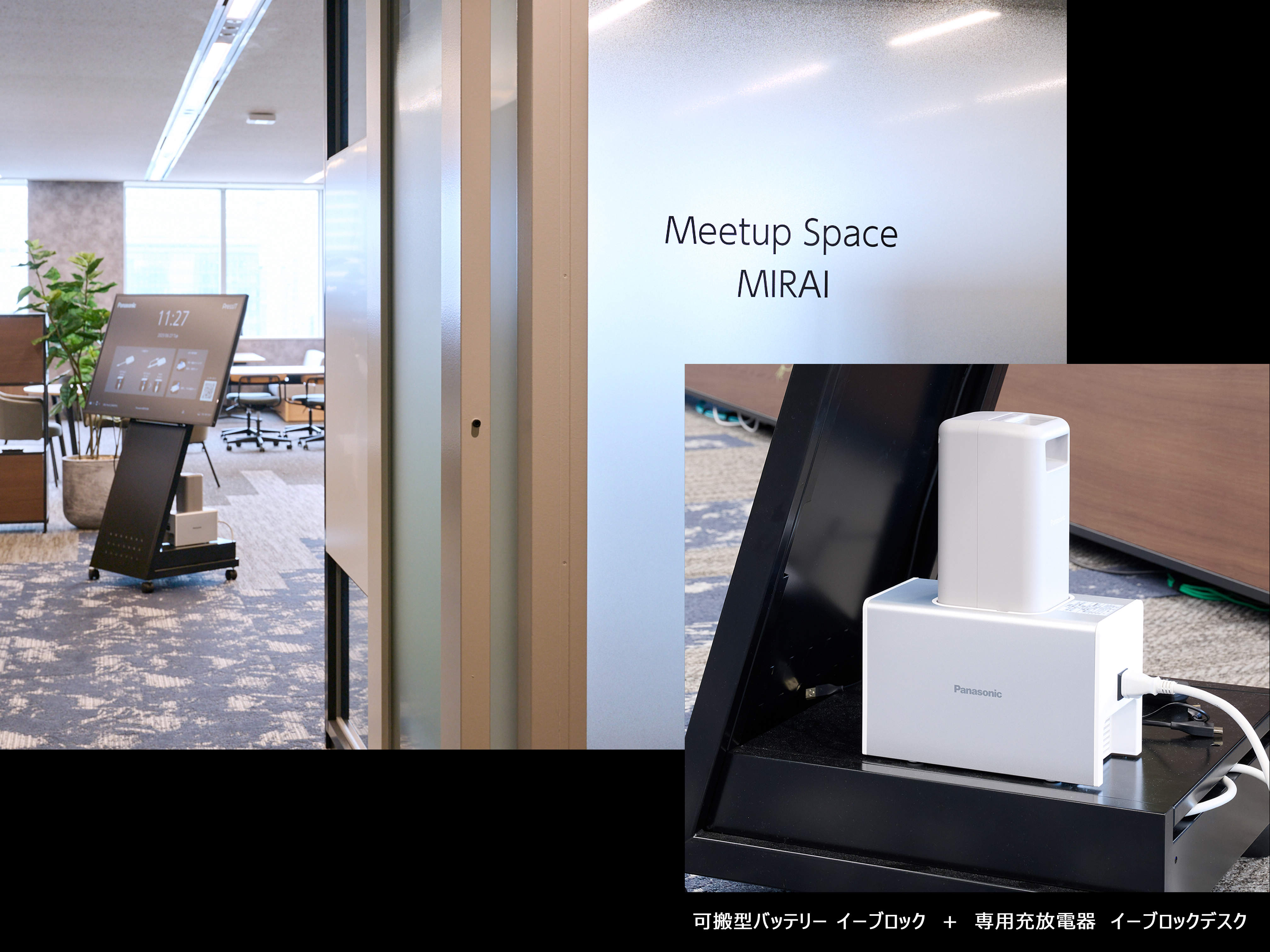 e-blockを可動式大型モニターのバッテリーとして活用することで、コンセントのない場所でも大型モニターを使用した会議が可能に。