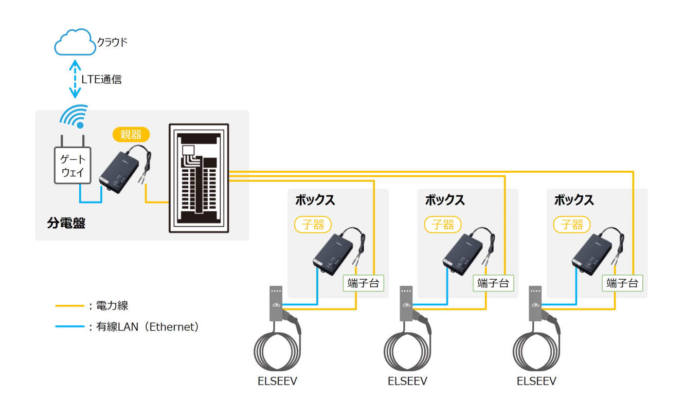 各充電設備と駐車場内の分電盤にPLCアダプターを設置し、電力線を使ってデータを送受信、