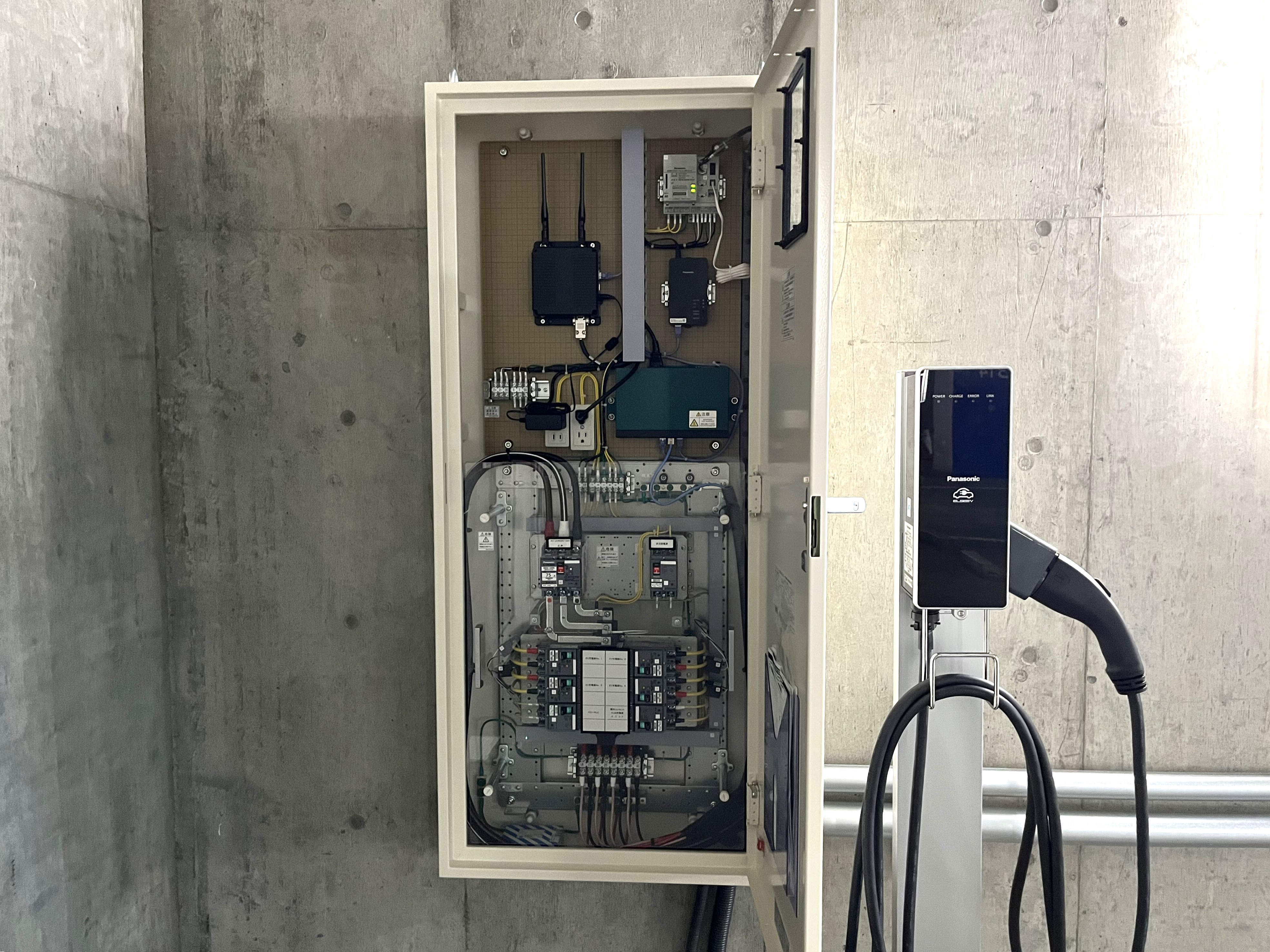 駐車場内の分電盤にPLCアダプター(親器)、3台の充電設備にPLCアダプター(子器)を取り付けており、利用データはPLCアダプターにより電力線を使って送受信しています。