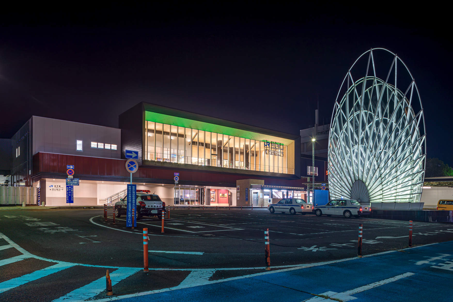 駅の象徴となるファサードは大きなガラスで駅の中を見通せる非常に透明感のある造りとなっています。周辺の駐車場やロータリーの既設照明と切り分け、“米子駅”と一目でわかるように軒下のダウンライトを含めた駅の施設の照明は全て3500Kの色温度に統一することで区別しています。