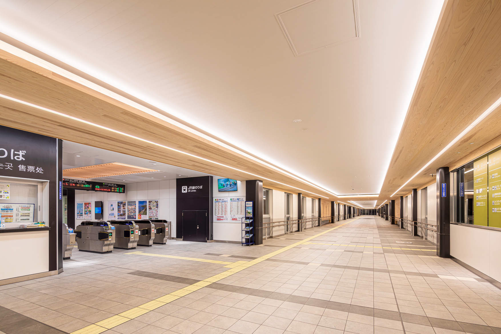 天井面に自由通路と同じ智頭杉を使用しており、この“材質を目立たせる目的と、空間を明るく開放的に見せる目的”の両方を黒い四角柱に取り付けたアッパー照明が担っています。