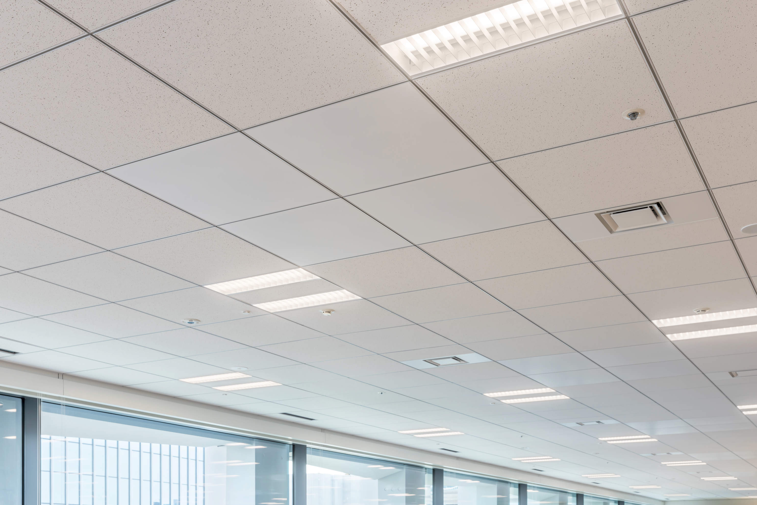 システム天井用器具とWiLIA調光スポットライトが執務空間にエリア分けされ配置されています。照明制御システムの空間環境センサやタイムスケジュールで照明制御をしています。