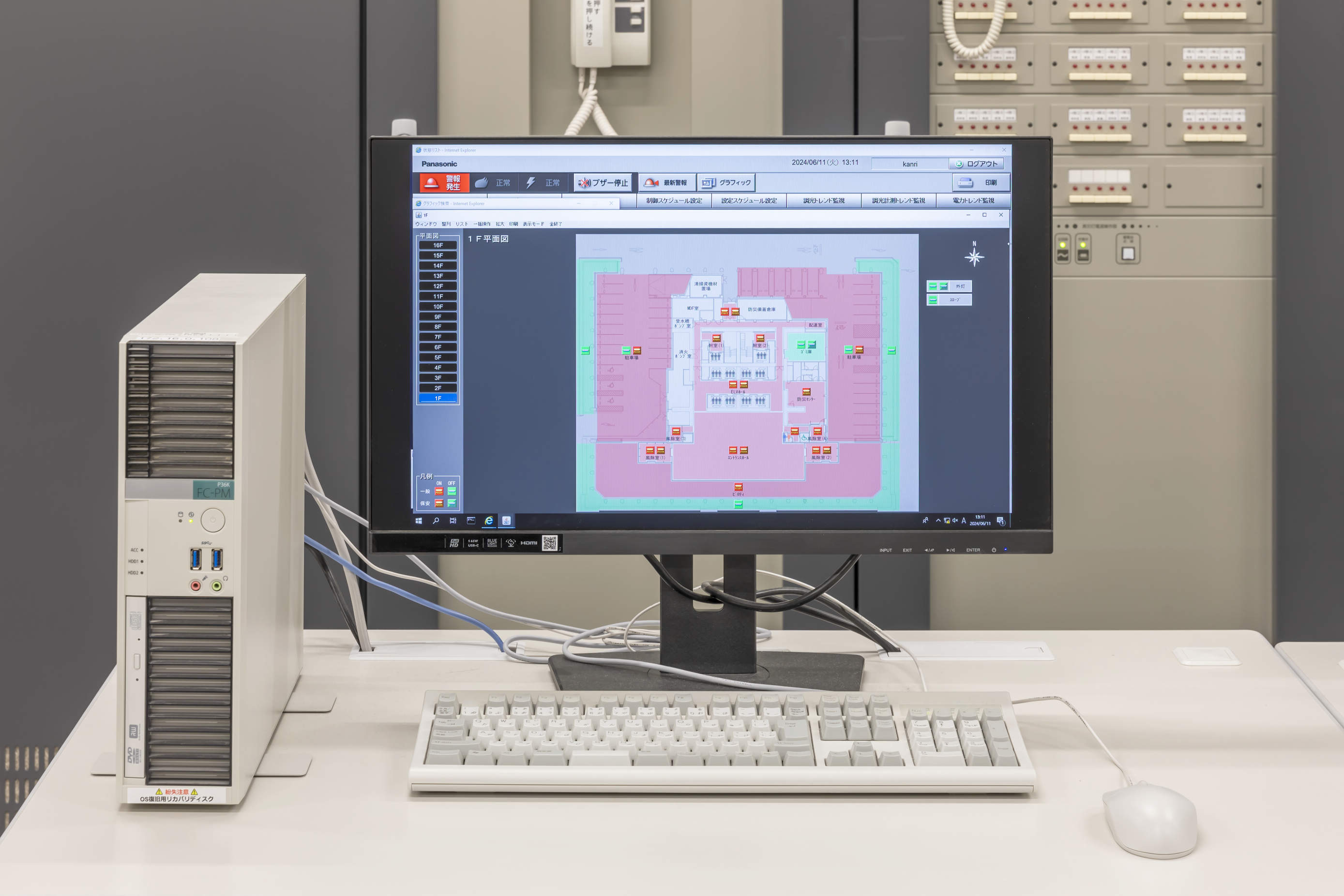 照明制御システム「FreeFitMX」の監視装置と執務エリアに「空間環境センサ」が設置されています。空間環境センサで人検知をしない場合は調光点灯へ切替。また、タイムスケジュールとの連動制御もしています。