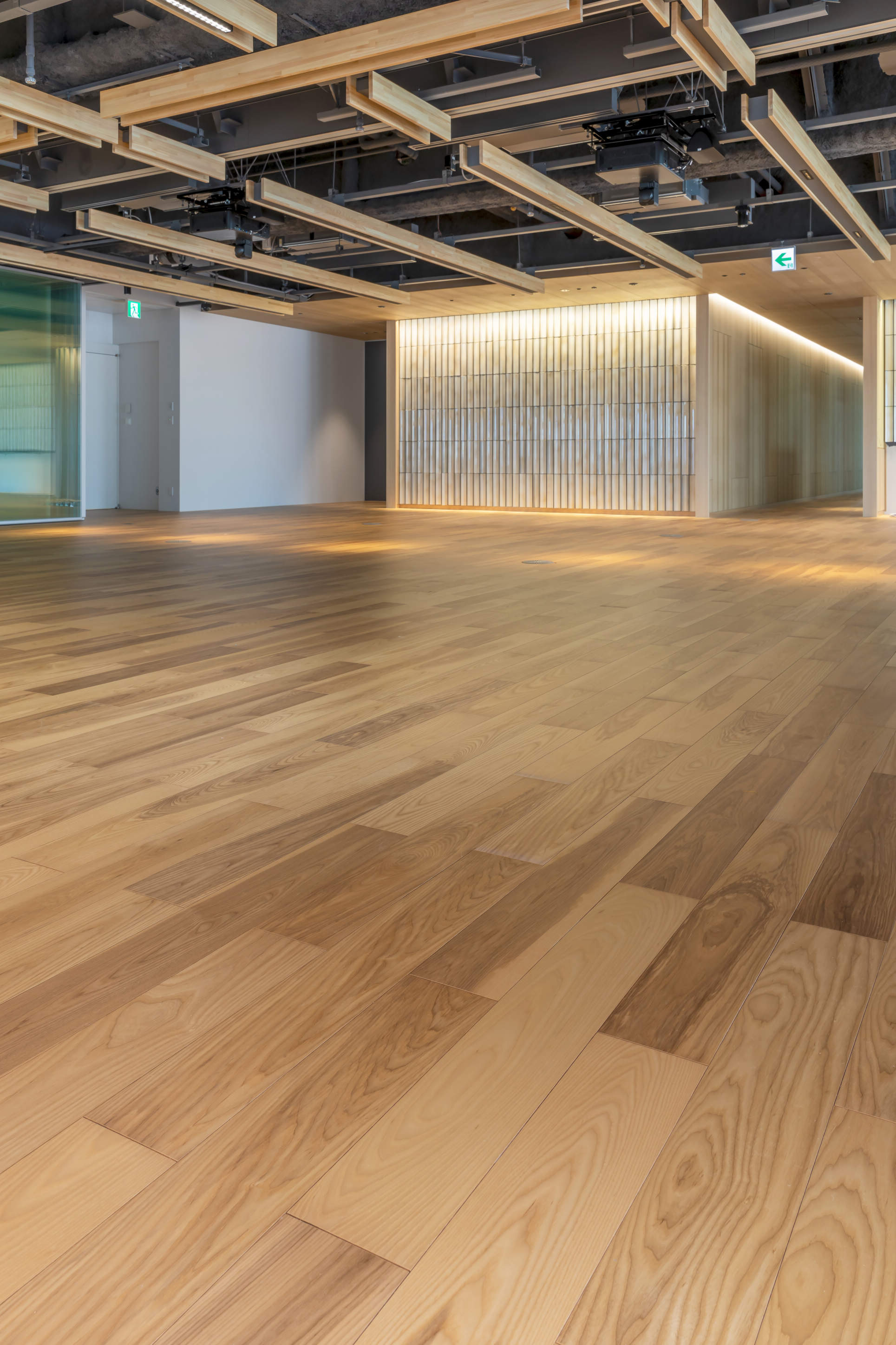 木ルーバー内に配線ダクトが設けられ、無線調光調色スポットライトやグレアに配慮したグレアセーブライン(ベースライト)が設置されています。執務、打合せ、イベントなど多様なシーンに適応可能な照明計画としています。