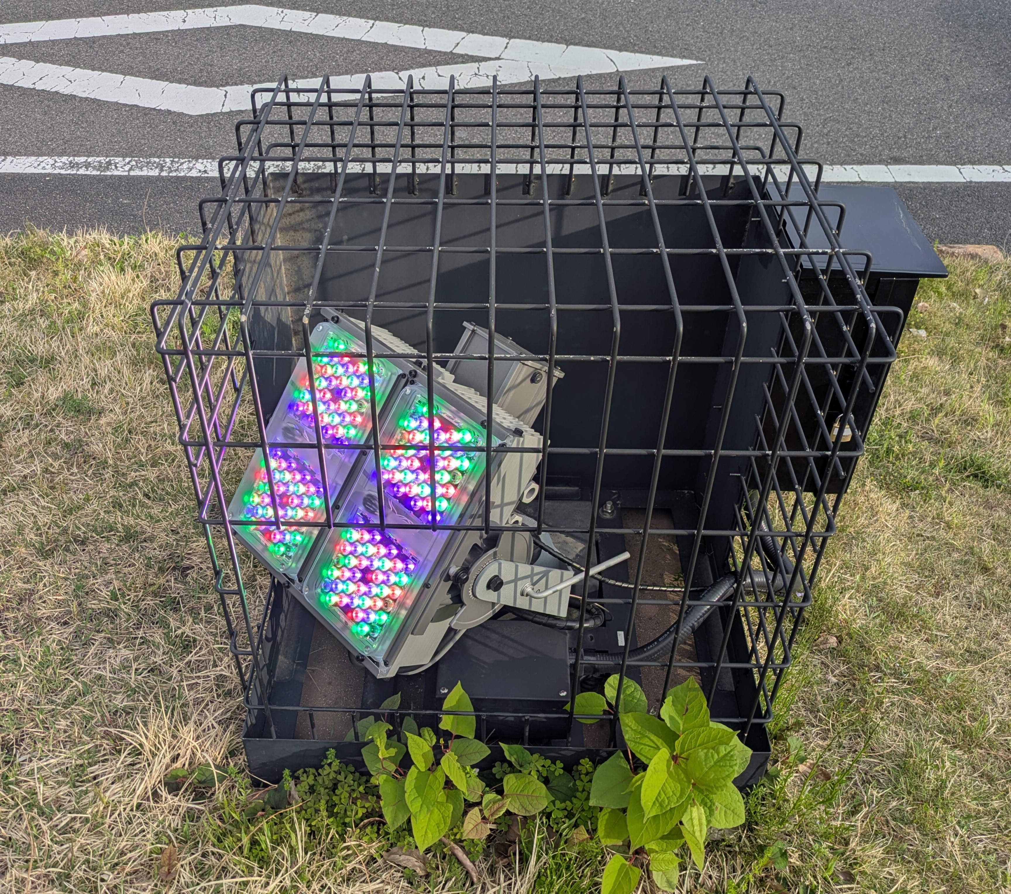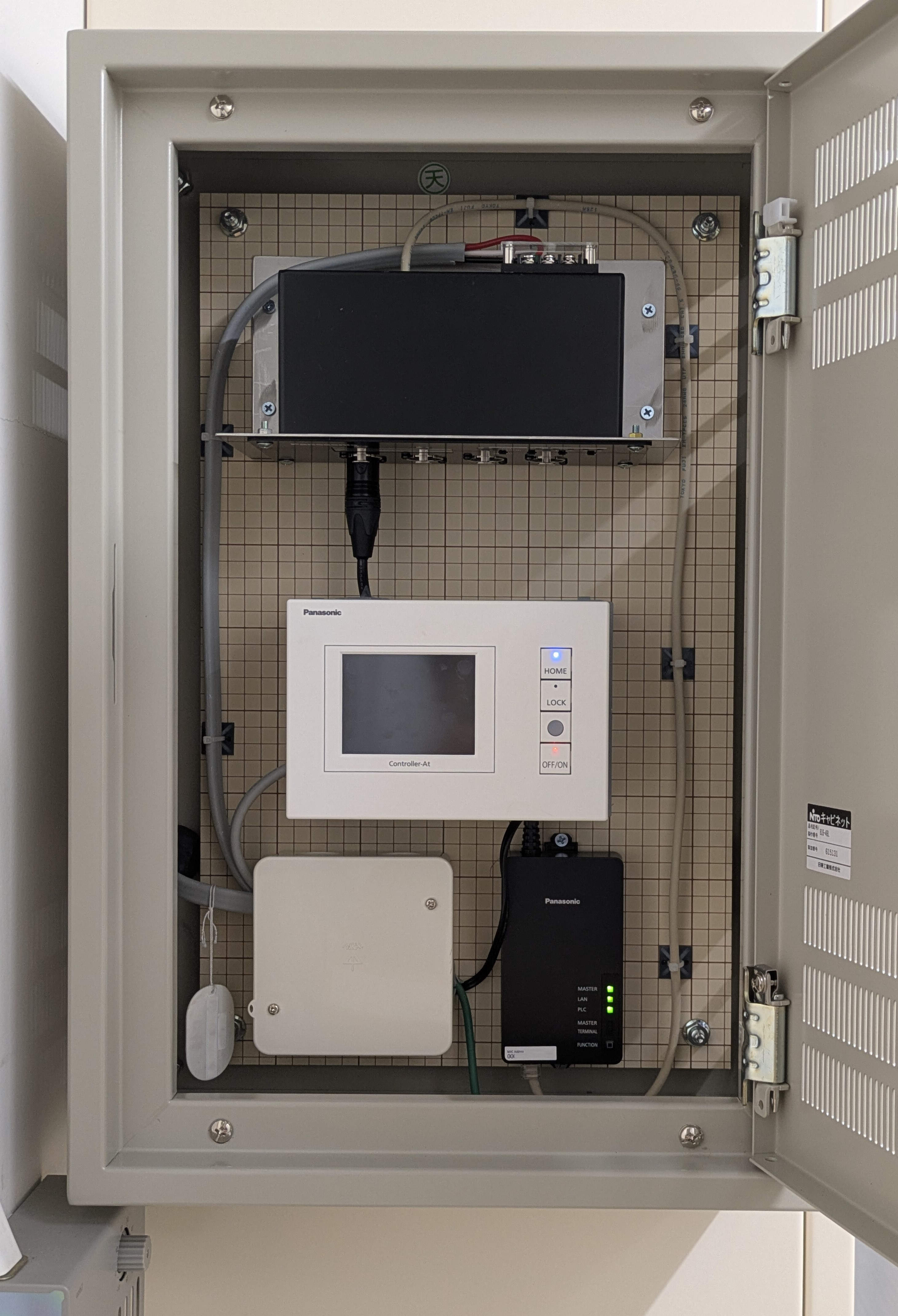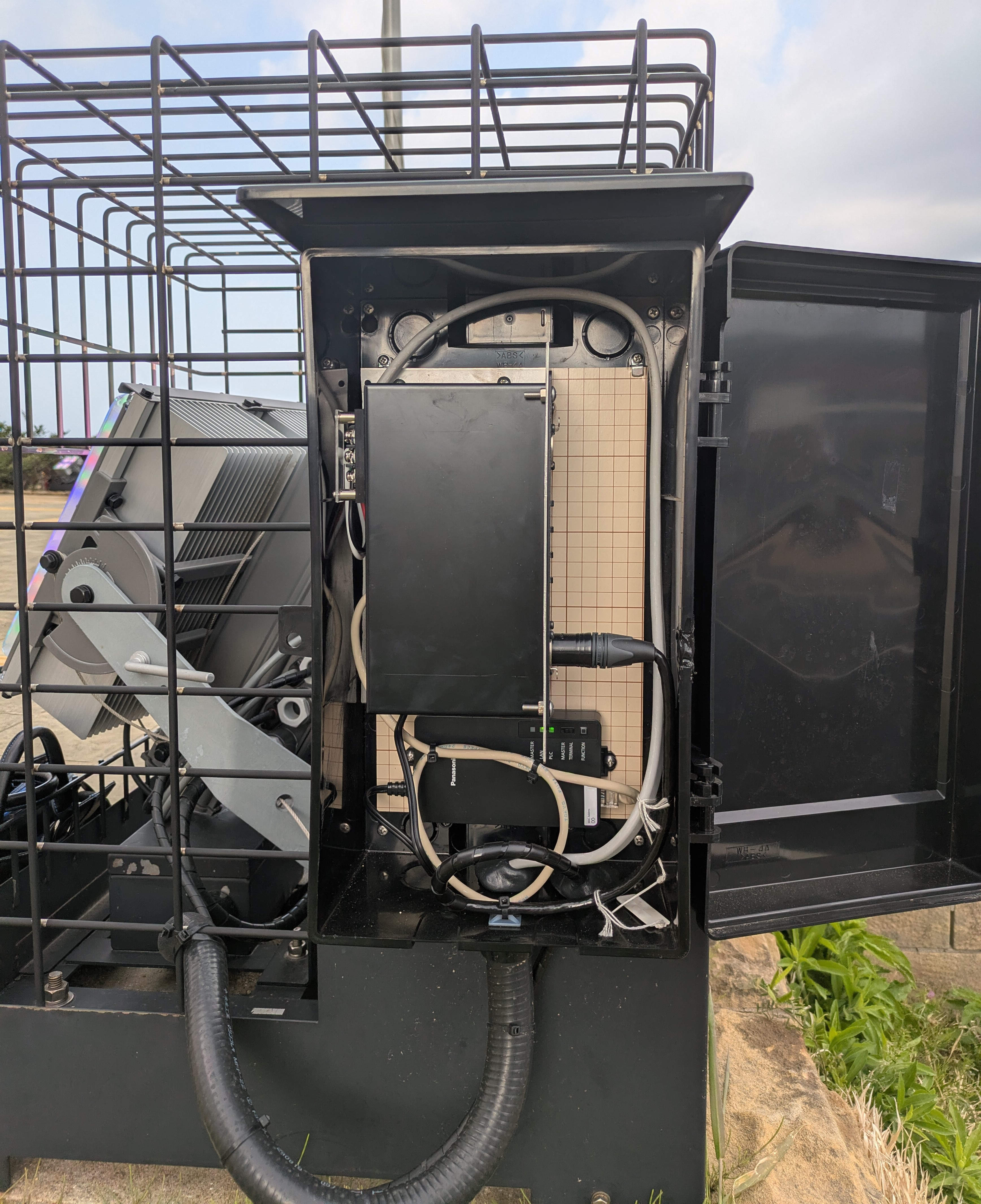 屋外の各ダイナペインターにはEthernetとDMXの変換器、PLCアダプターが取り付けられている。