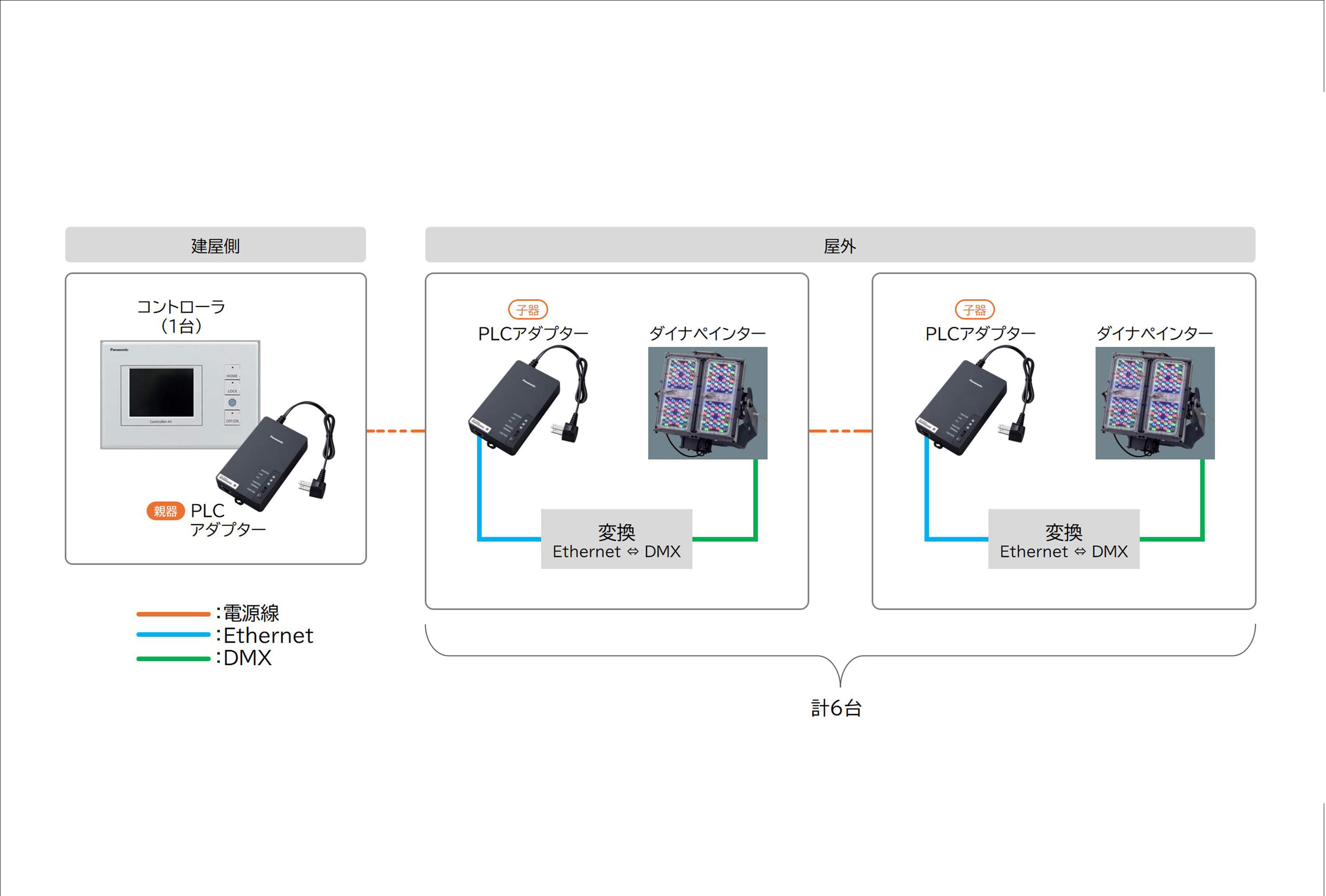 建物内の制御盤から発信された制御信号はPLCアダプターで電源線に載せられ、各ダイナペインターに取り付けられたPLCアダプターに送られる。