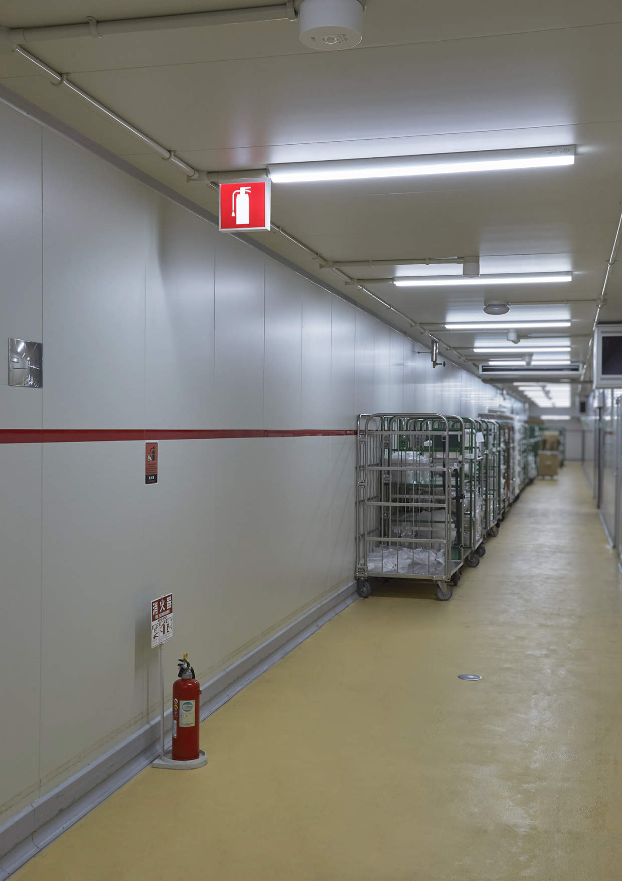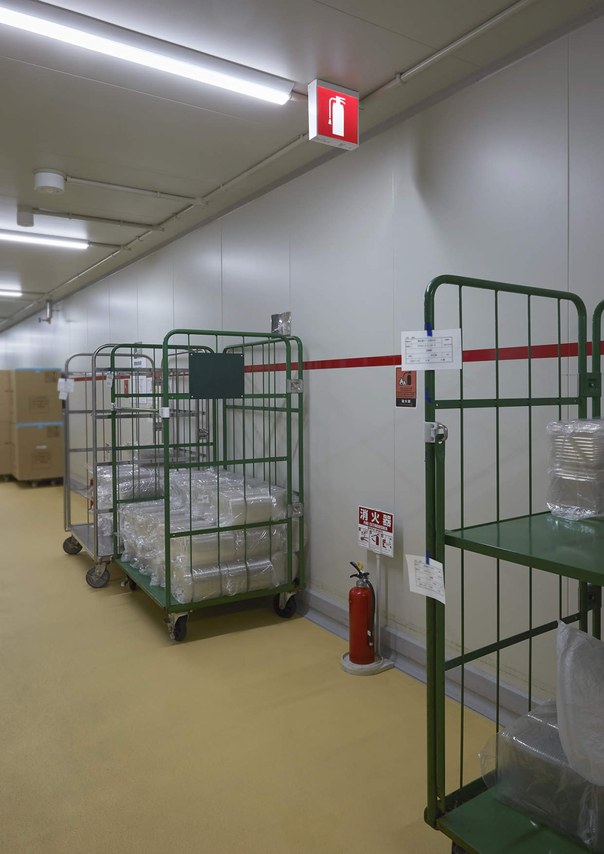 コンビニエンスストア向けにお弁当やおにぎり、お惣菜などを提供する中食事業を展開しているわらべや日洋グループで初めての調理麺専用工場です。周りに物があっても視認性がよく、工場内で働いている外国人の方でもピクトグラムで分かりやすい消火器標示灯をご採用いただきました。
