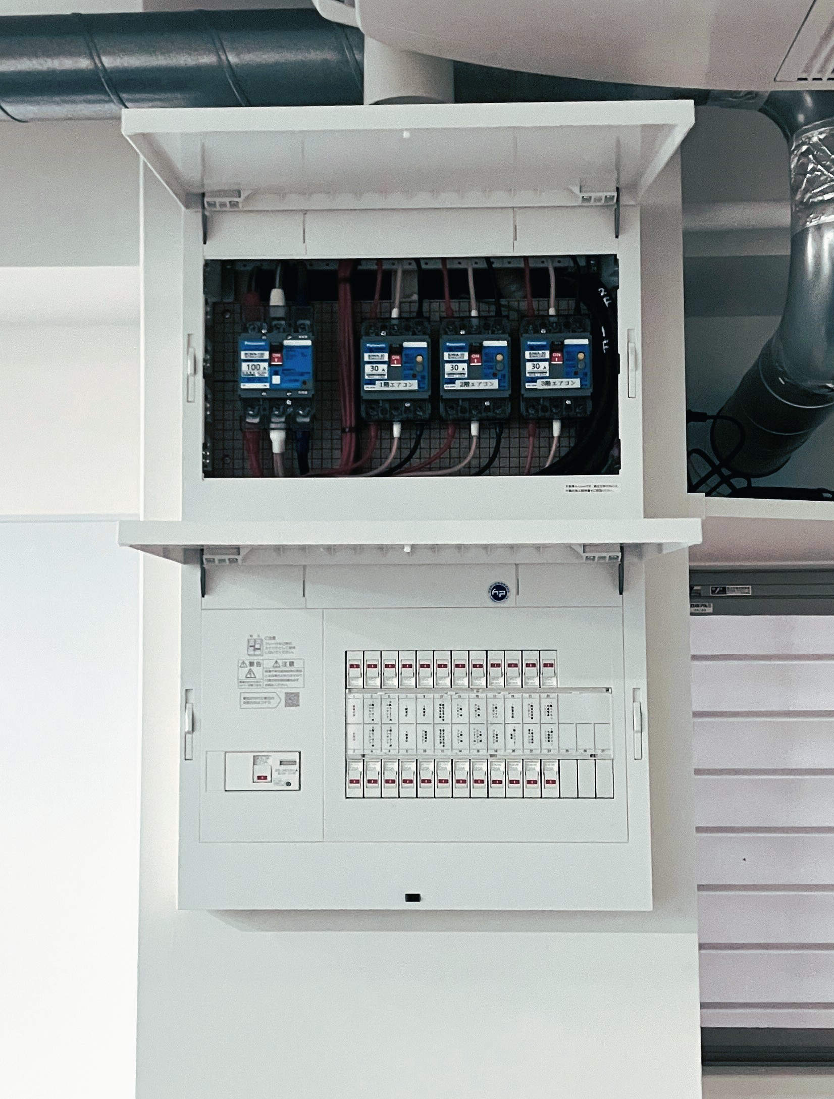フリーボックスには、空調設備用電源にGDブレーカを設置し、分岐して住宅分電盤を室内用電源にご活用いただきました。 隙間無く連接設置ができ、配線は露出することなく、スッキリとした外観を保ち施工していただきました。