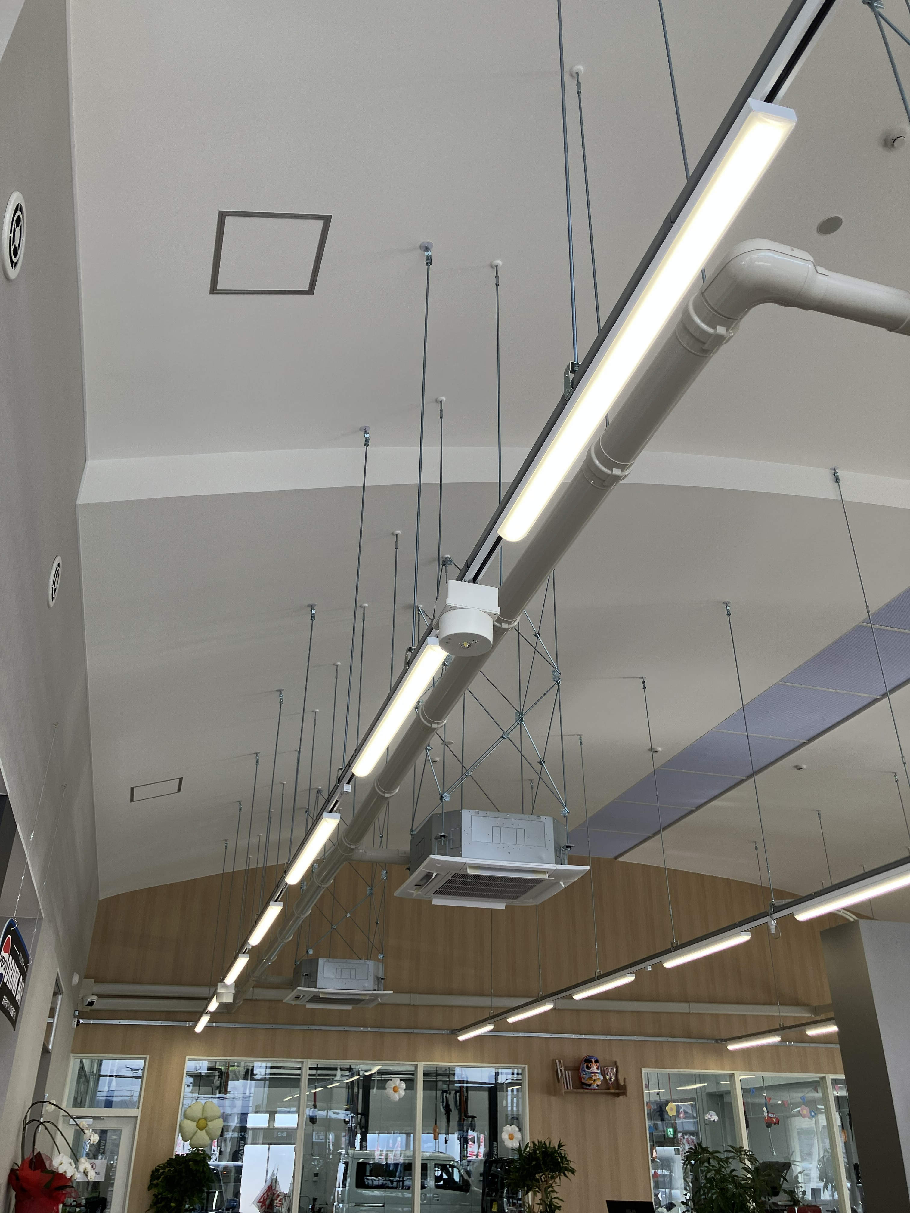 ワンフロアの店舗は壁が無くコンセントの位置が限られていた為、天井にOSラインダブルを張り巡らせ照明とコンセントを同時に使用しています。