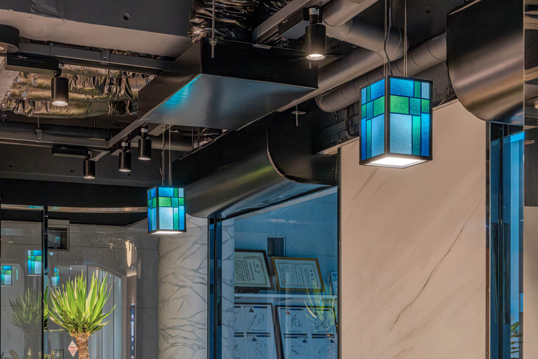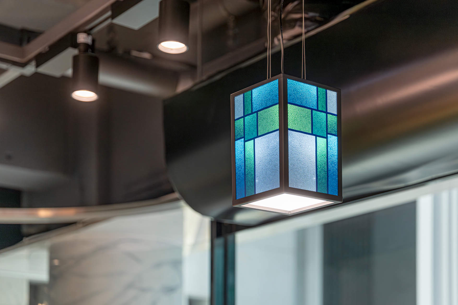 2Fの休憩スペースでは、間接照明・ペンダント・スポットライトを組み合わせ、メリハリのある落ち着いた空間へと改良しています。
