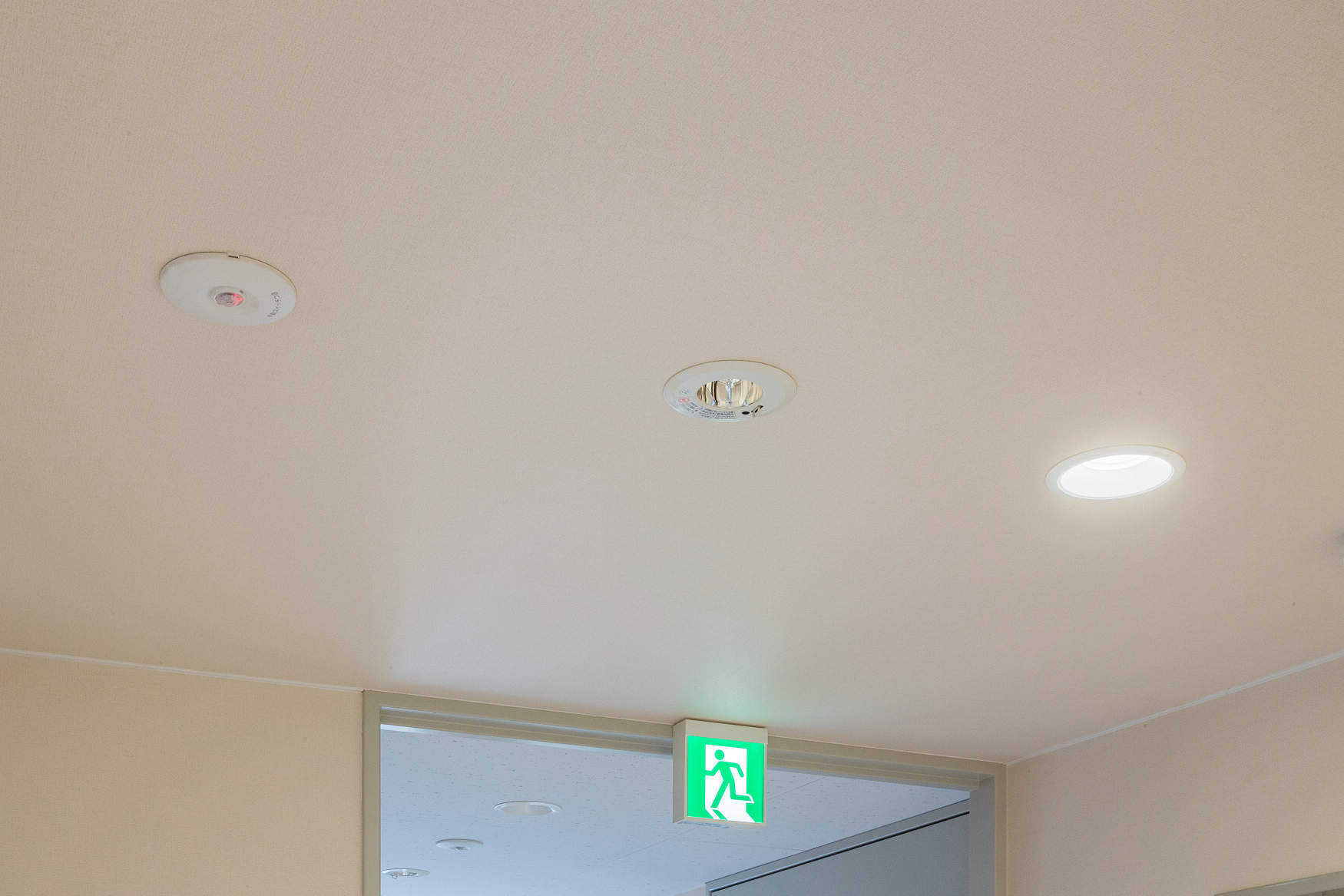 省エネ性向上のために、本社の通路にLED照明「EVERLEDS(エバーレッズ) ワンコア(ひと粒)タイプダウンライト(人感センサ付)」や「LED誘導灯」「非常灯」を、屋上にはLED屋外用スポットライトを採用。