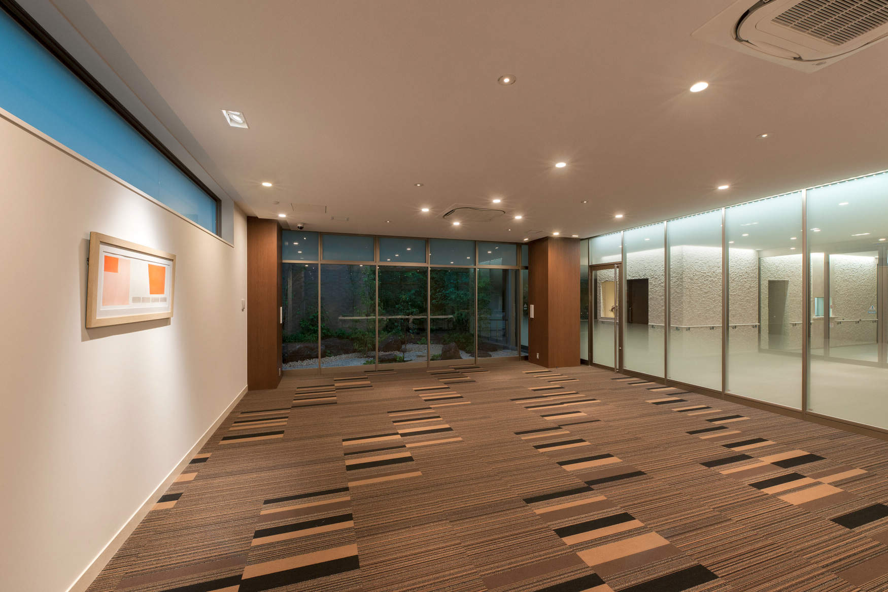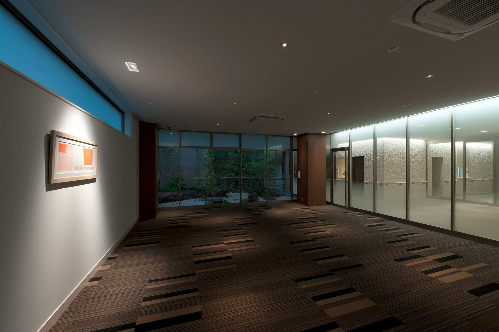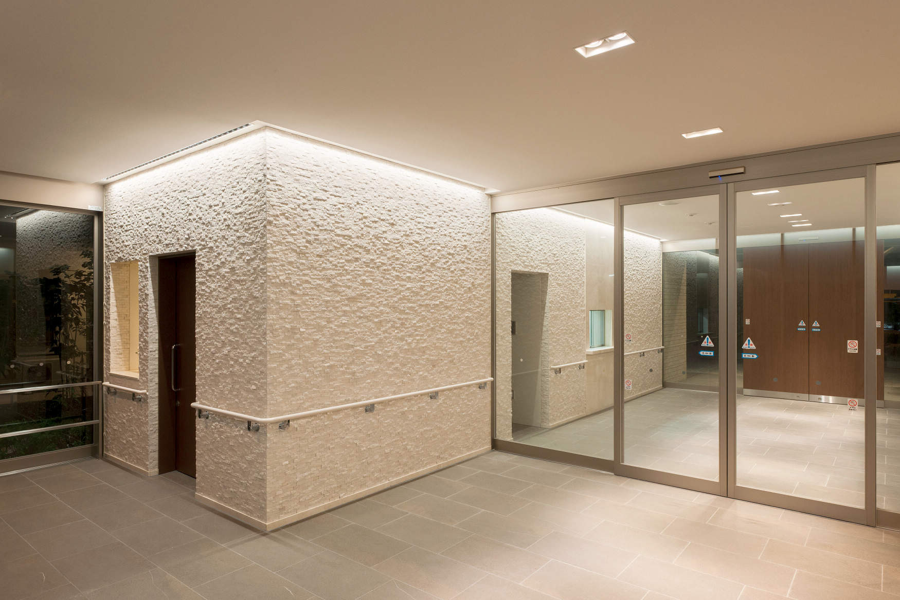 上下にすり加工の入ったガラスを上部からLEDライン型ダウンライトウォールウォッシャタイプ(温白色)で照射、柱周りはウォールウォッシャで照射しています。