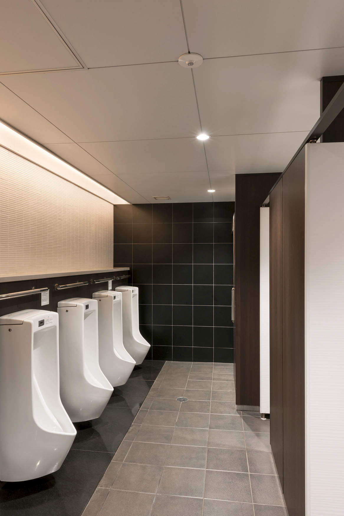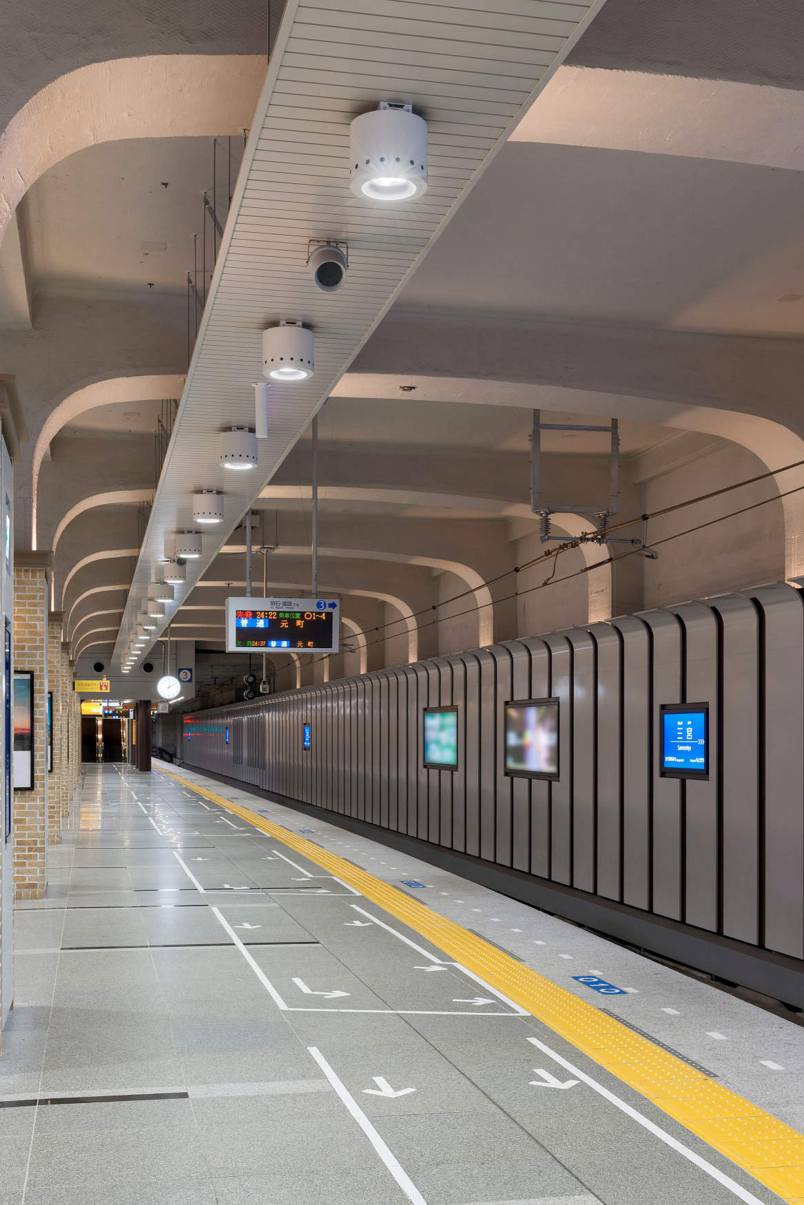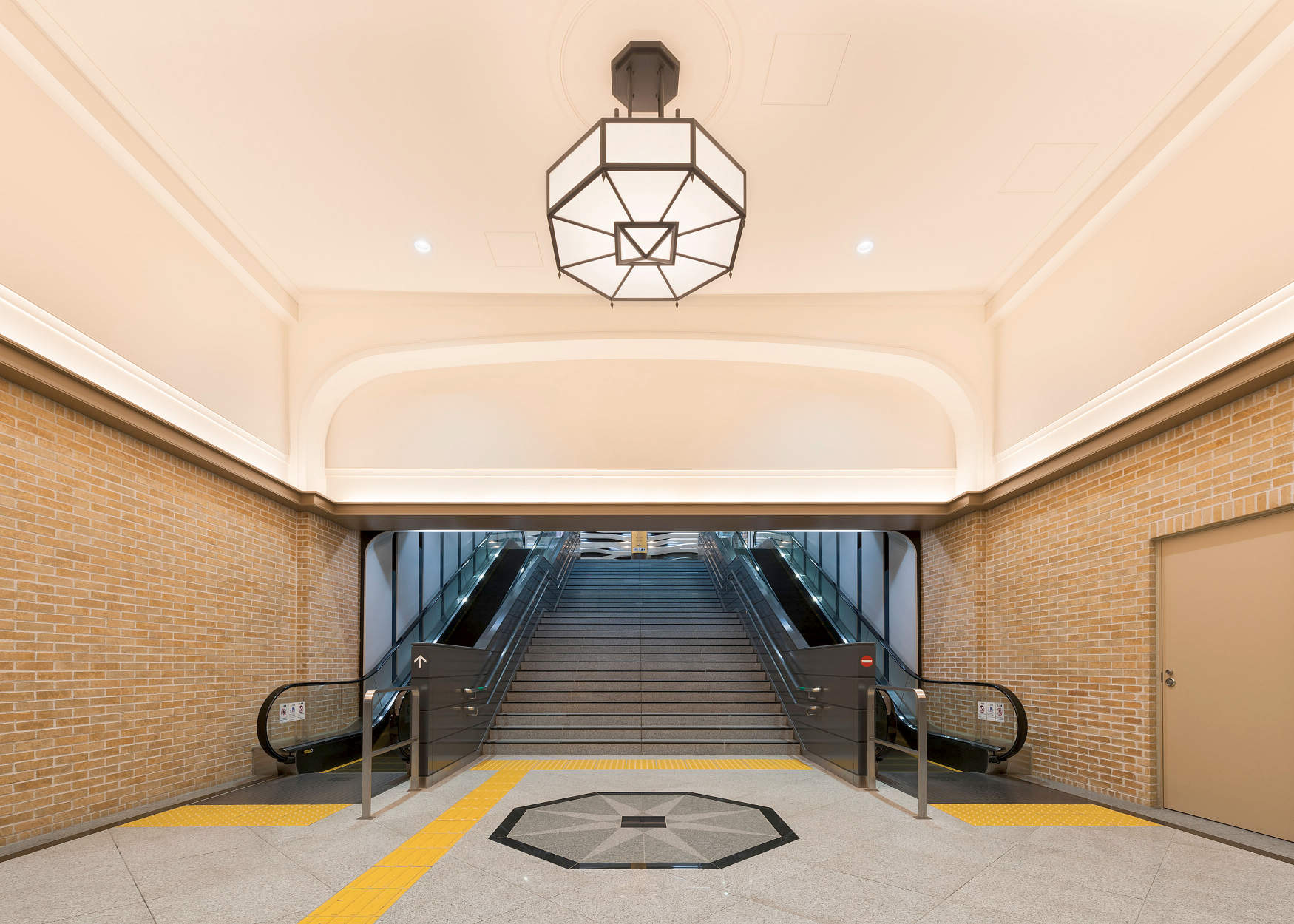 昭和8年に地下化された当時、設置されていたペンダントを模して製作された特注ペンダントにLEDを内蔵しています。周囲の間接照明とダウンライトは色温度3500Kで構成。