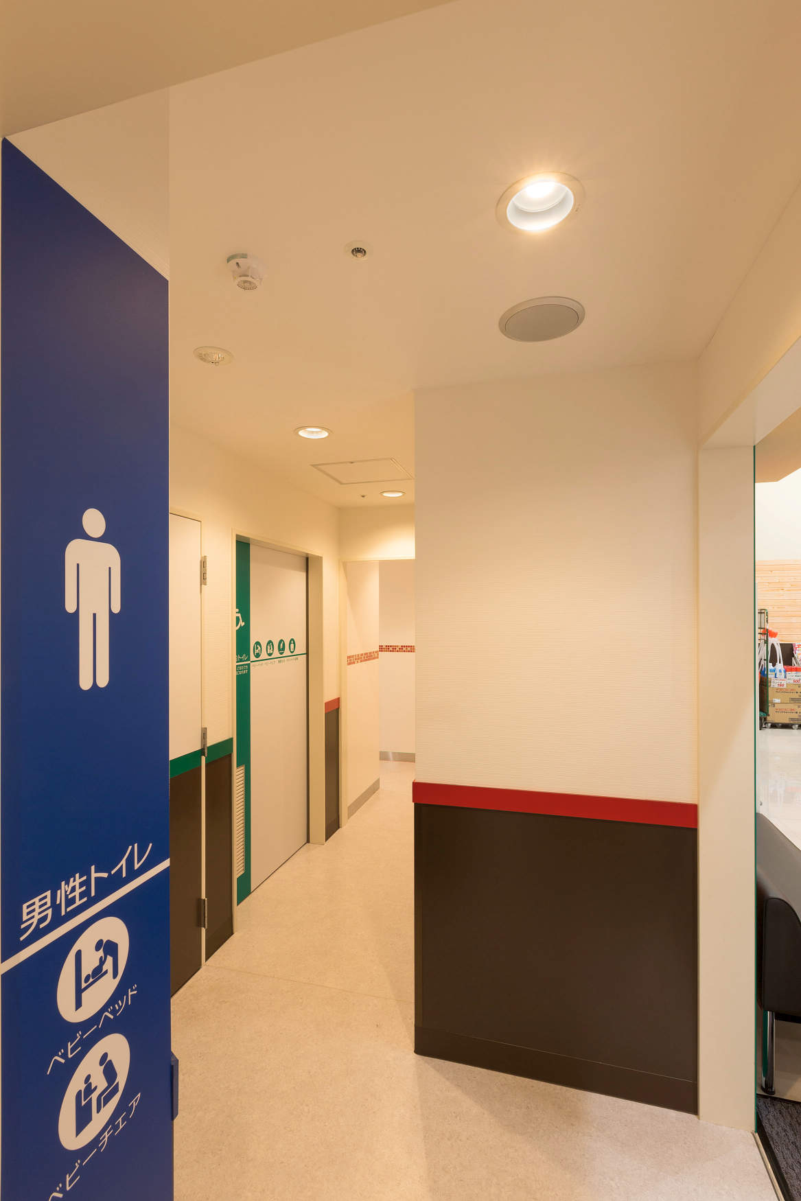 トイレ前室には、アレンジ調色照明を採用し、昼間は5000Kで高照度、夜間は3500Kで低照度と、時間帯により照度と色温度をタイマー連動により自動演出しています。