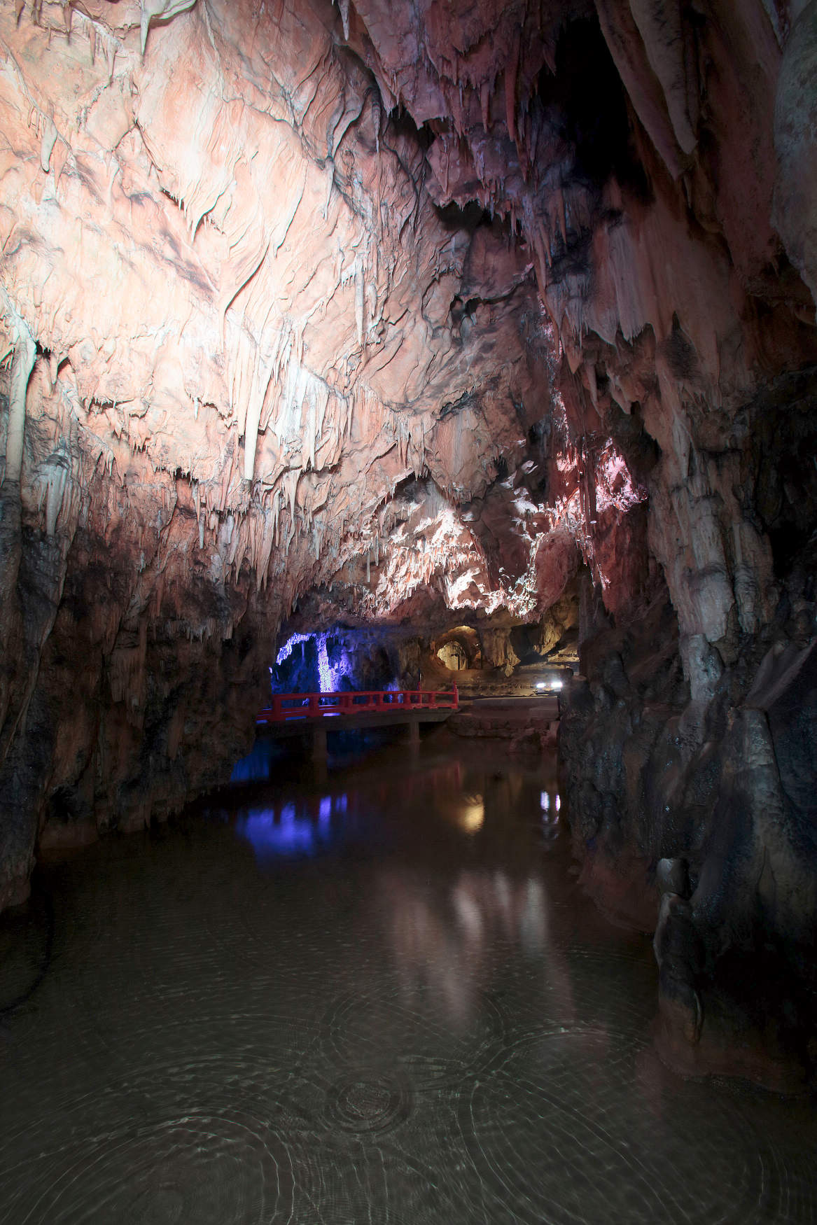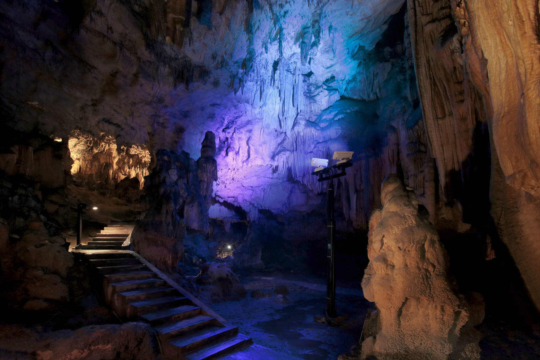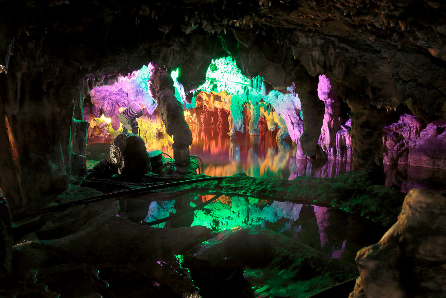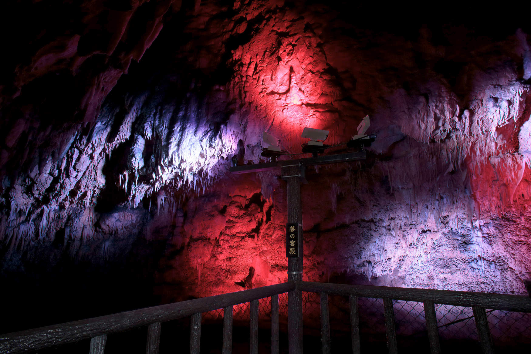 洞内最奥部、夢の宮殿(恋人の泉)から洞内カラー演出状況で、WallWasherShieldACXB40°+コントローラDで設定したフェード時間で投光された鍾乳石のカラー照明が変化するように設定されています。