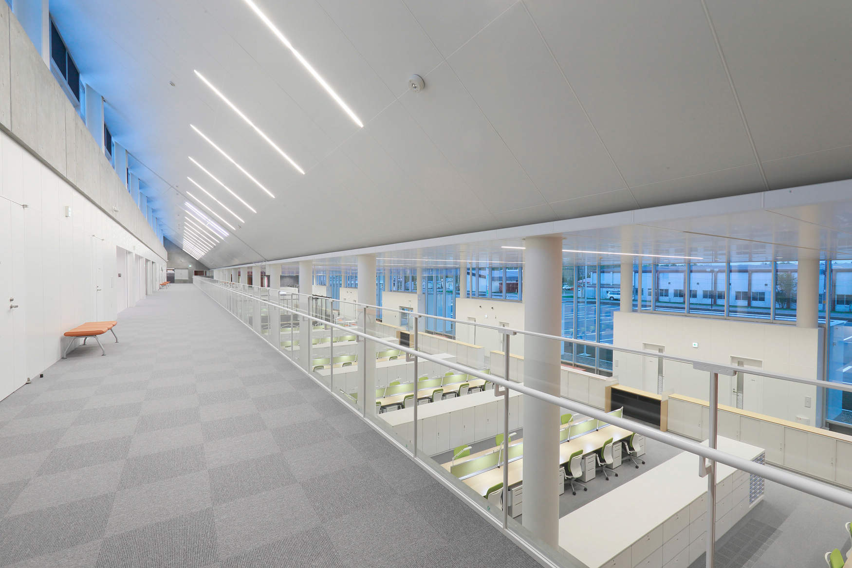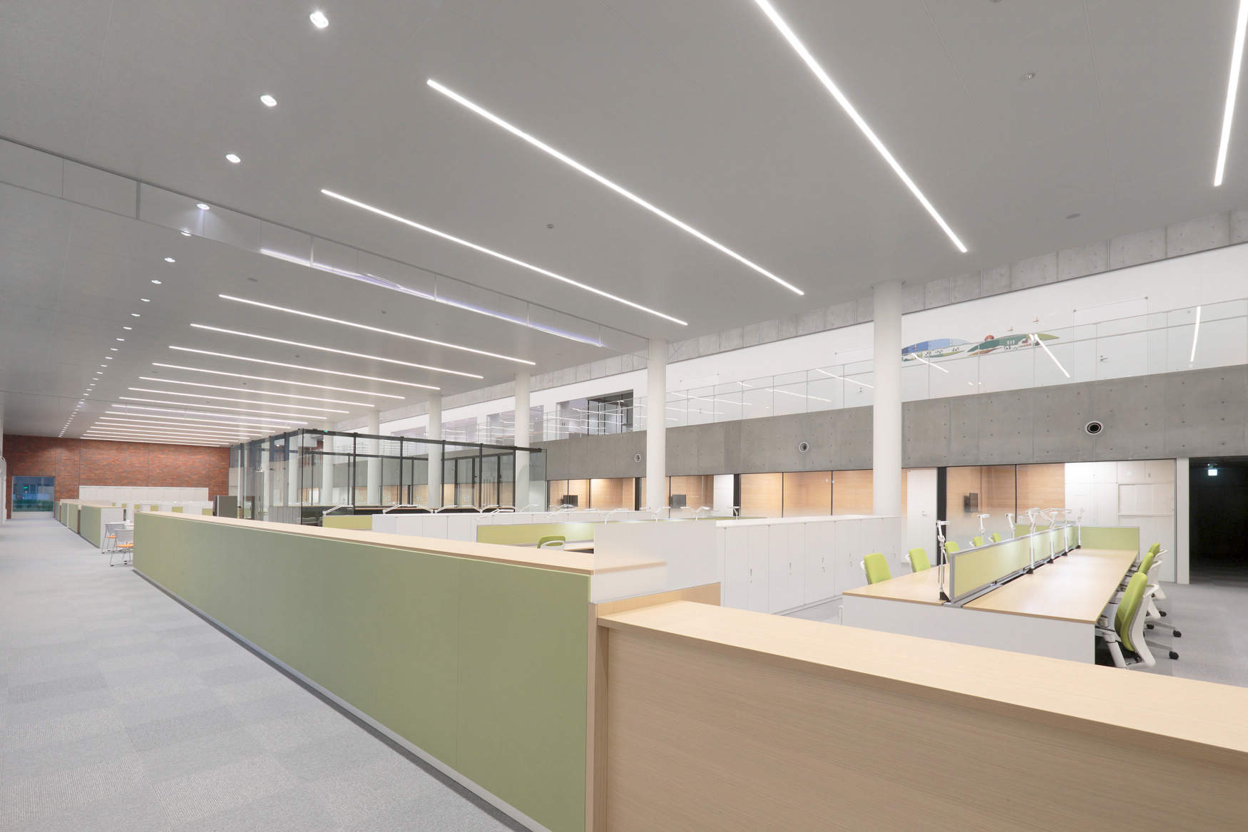 全面ガラス壁面に隣接する執務スペースは吹き抜け傾斜天井となっており、傾斜天井面にLEDスリムベースライトを2.8mピッチで連結配置、スリムでスッキリとした器具が吹抜け傾斜天井面を広く見せ、開放的な空間を構成しています。設計照度は300~500lxとやや低めで設定、タスクライトと組み合わせることで750lx以上を確保する計画としています。