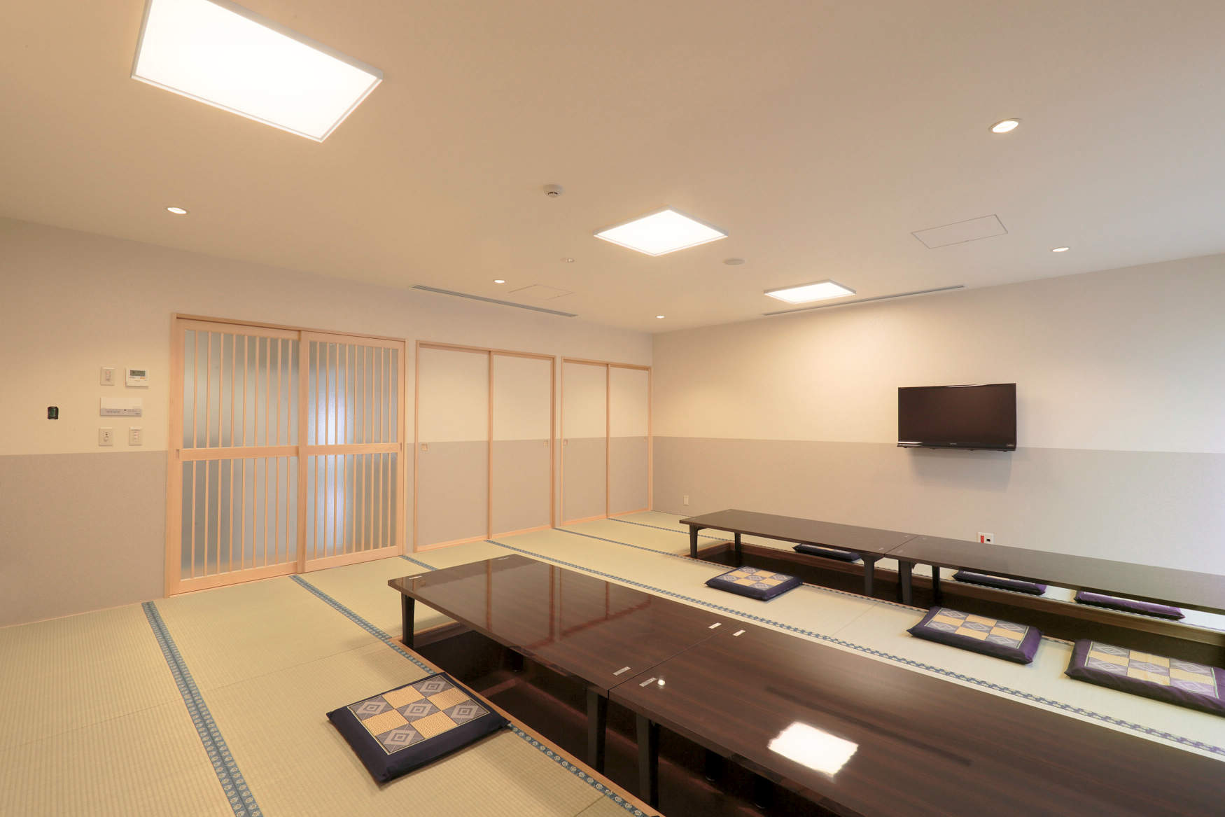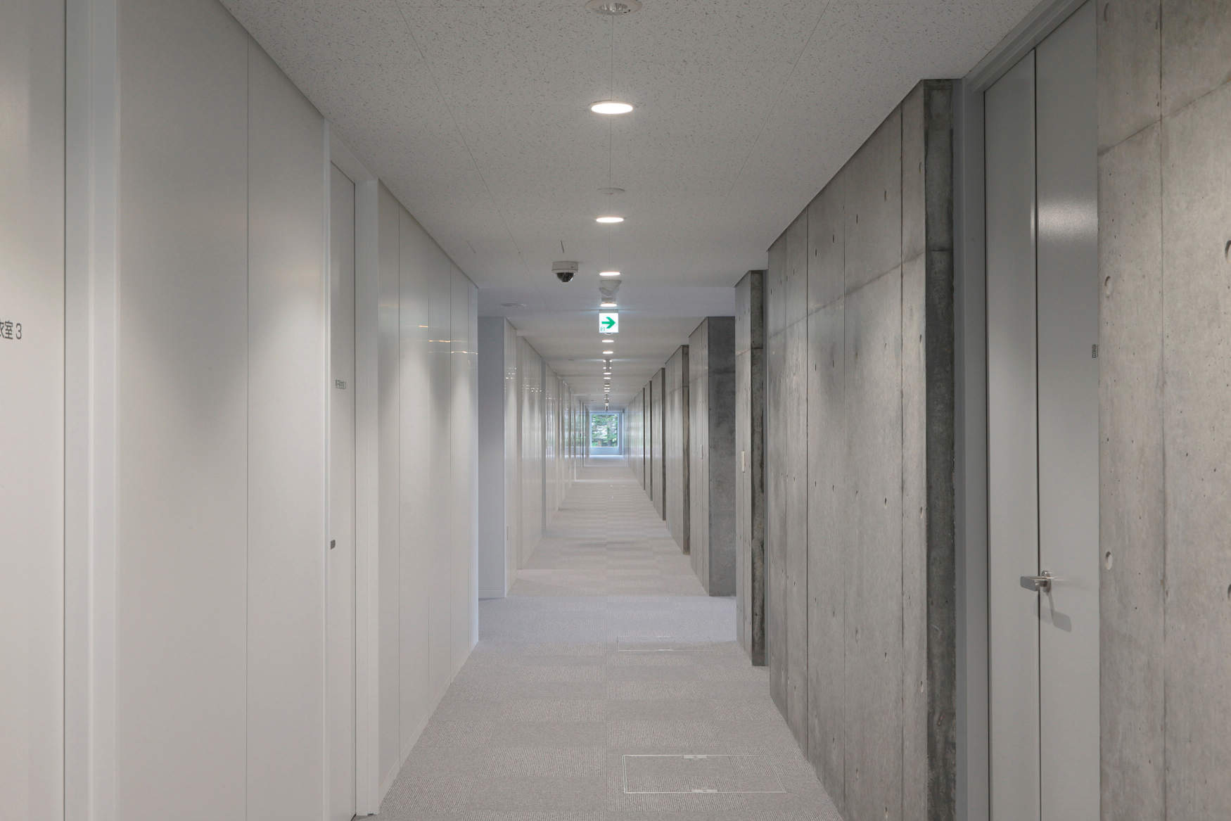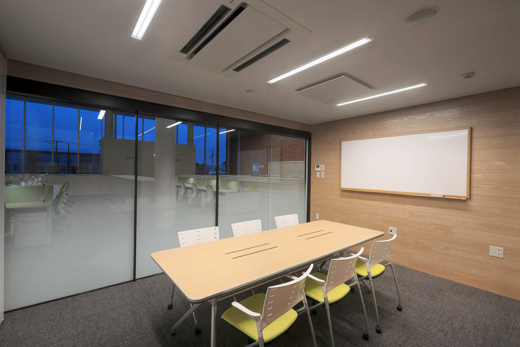 管理職スペースや会議室スペースが設けられ、個室にも関わらず視界が広く、より一層開放感を感じられる空間構成になっています。執務室同様LEDスリムベースライトを採用し、500lxを確保しスッキリとしたデザイン性で統一されています。