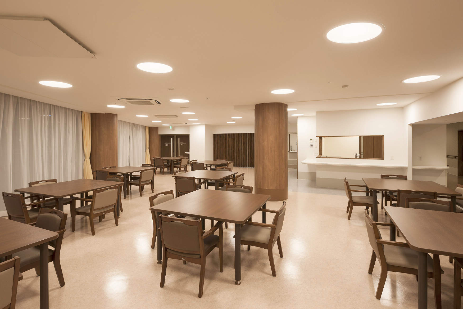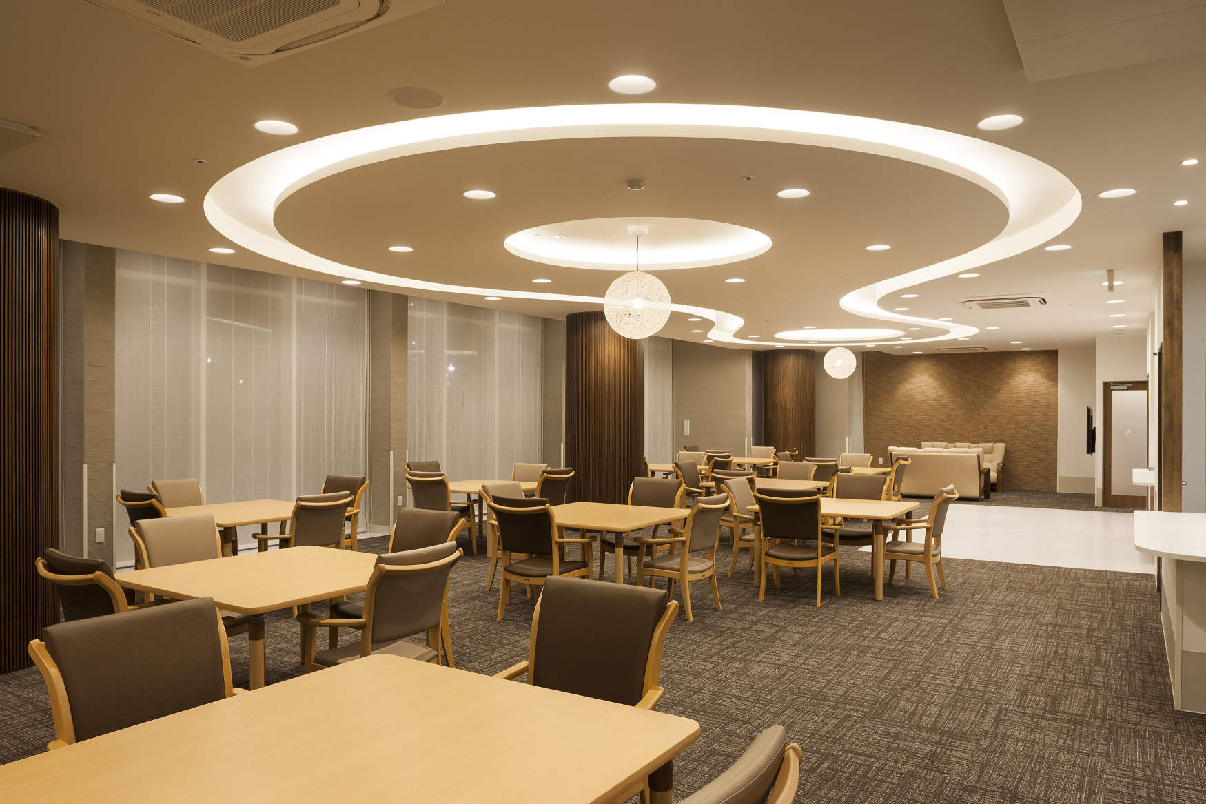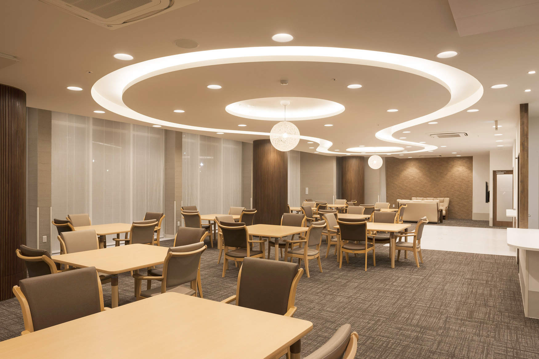 デイサービスの主要諸室である機能訓練室・食堂には、お年寄りが心地よく過ごせるよう、柔らかな光の間接照明を計画しました。その周辺に意匠性の高いソフトライトとペンダント照明をアクセントとして配置しています。