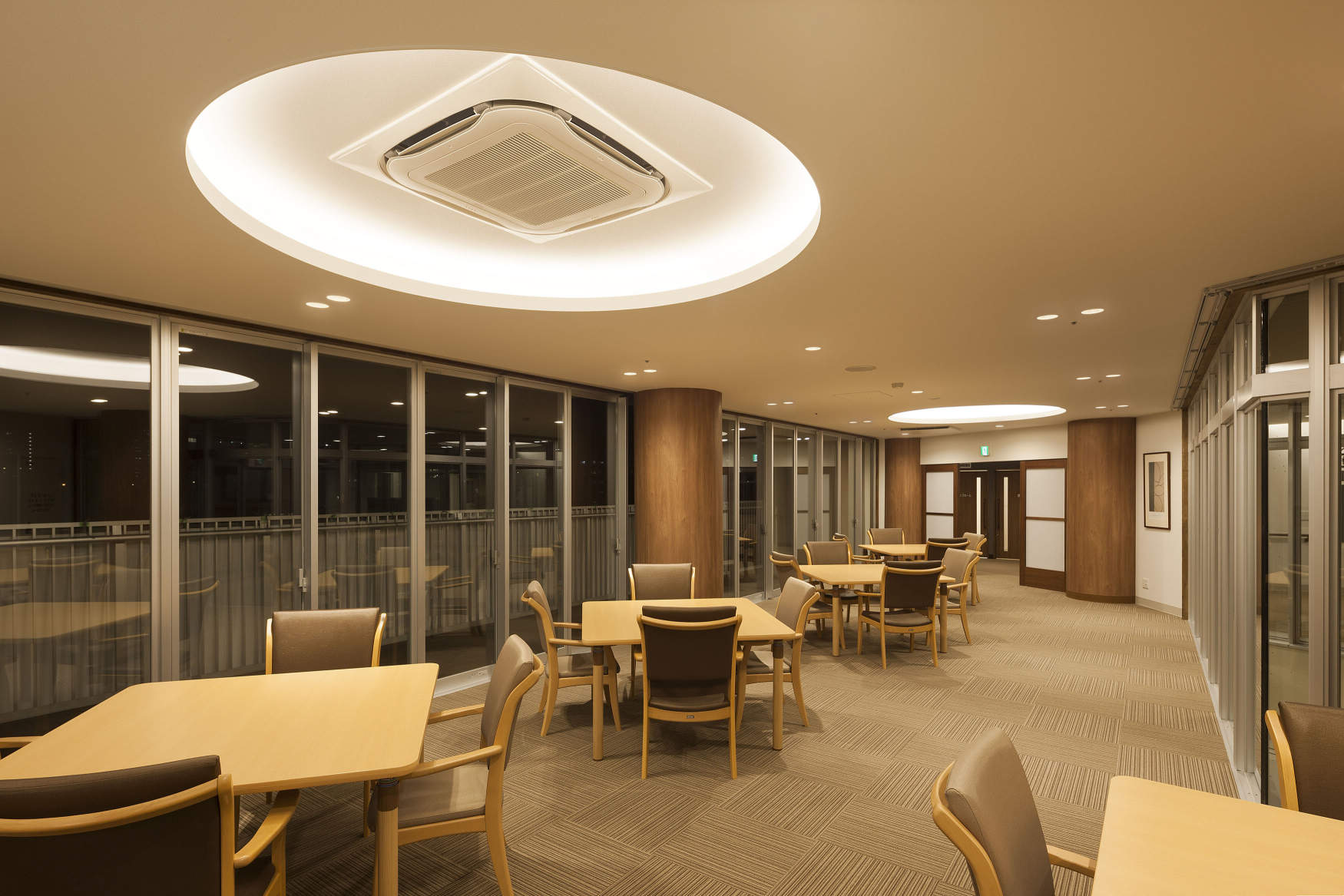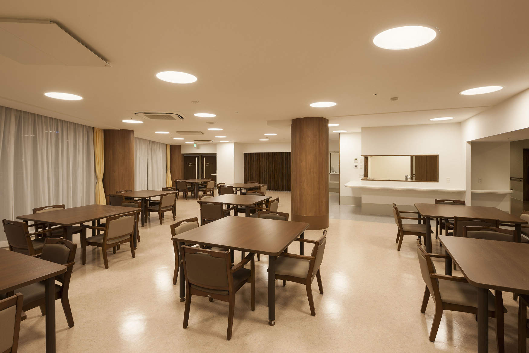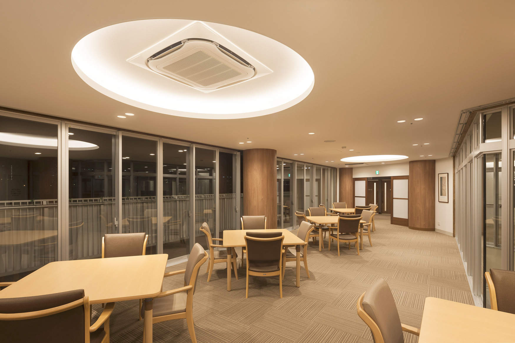 デイサービスの主要諸室である機能訓練室・食堂には、お年寄りが心地よく過ごせるよう、柔らかな光の間接照明を計画しました。その周辺に意匠性の高いソフトライトとペンダント照明をアクセントとして配置しています。