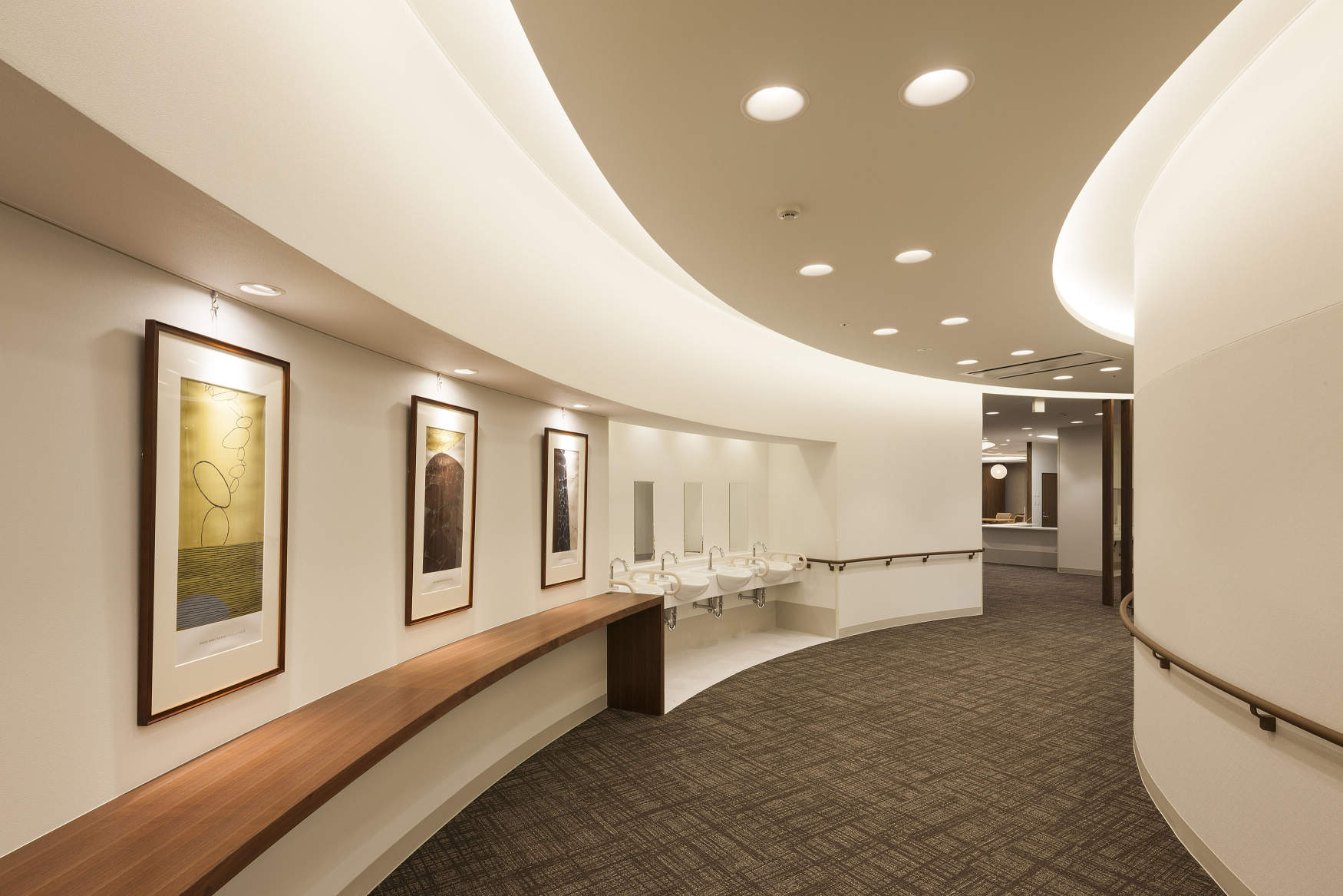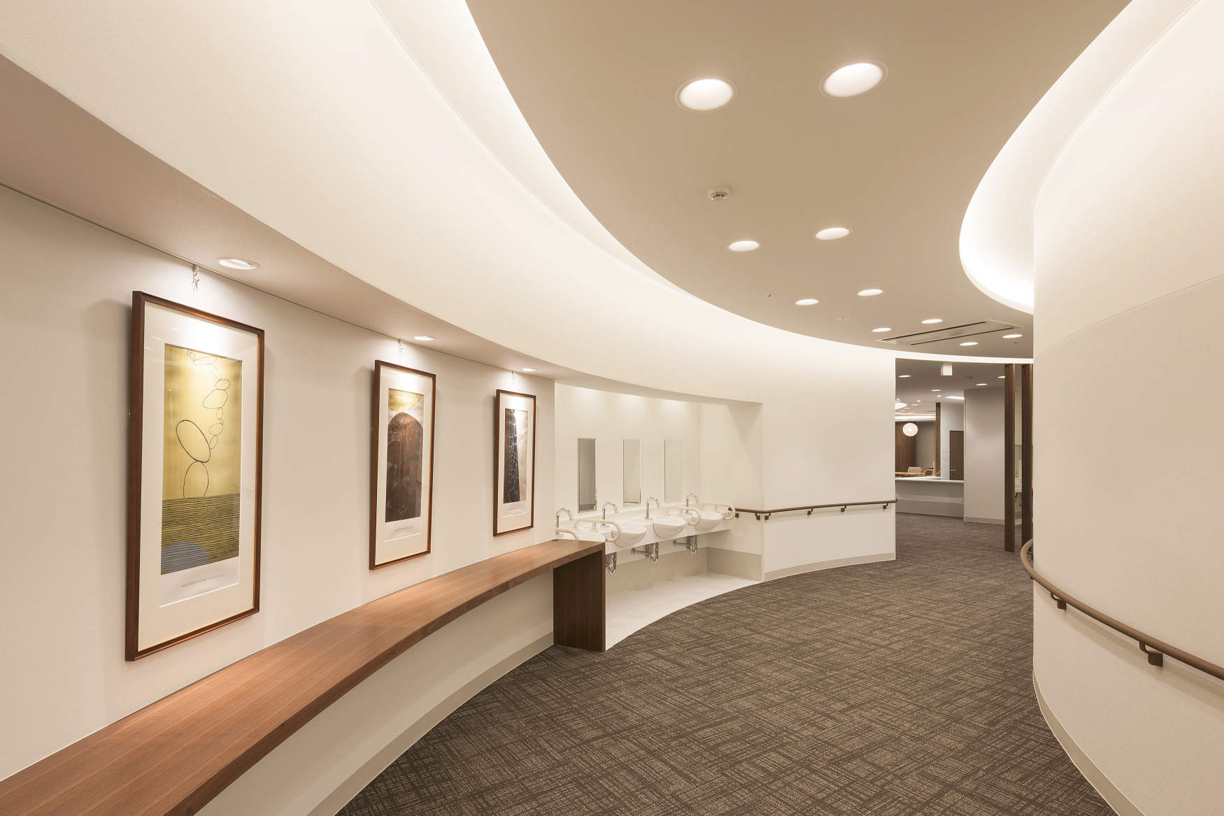 デイサービスに向かうエントランスギャラリーには意匠性の高いソフトライトを配置し、壁面には展示物を美しく見せるために美光色ユニバーサルダウンライトを採用しています。