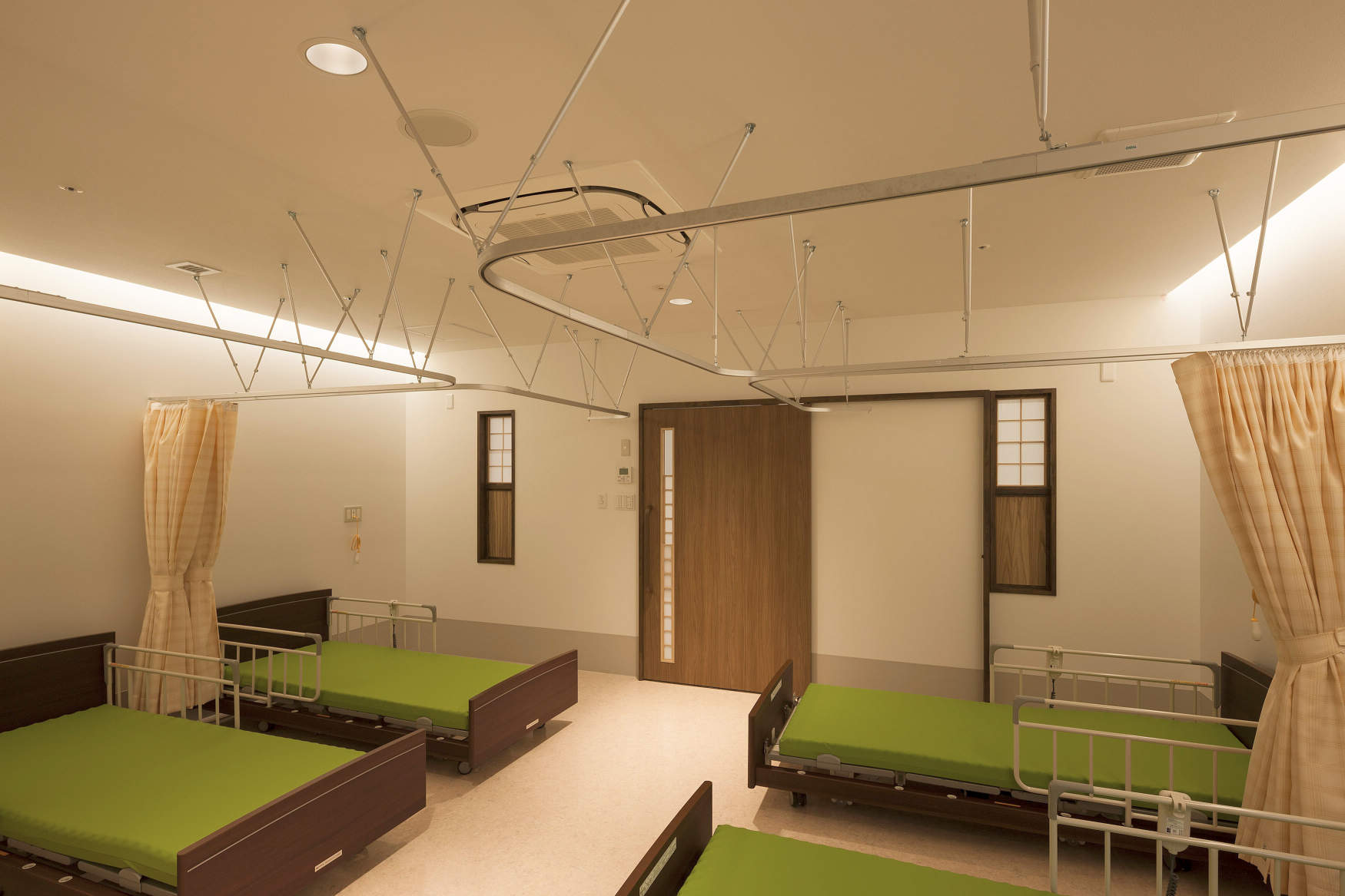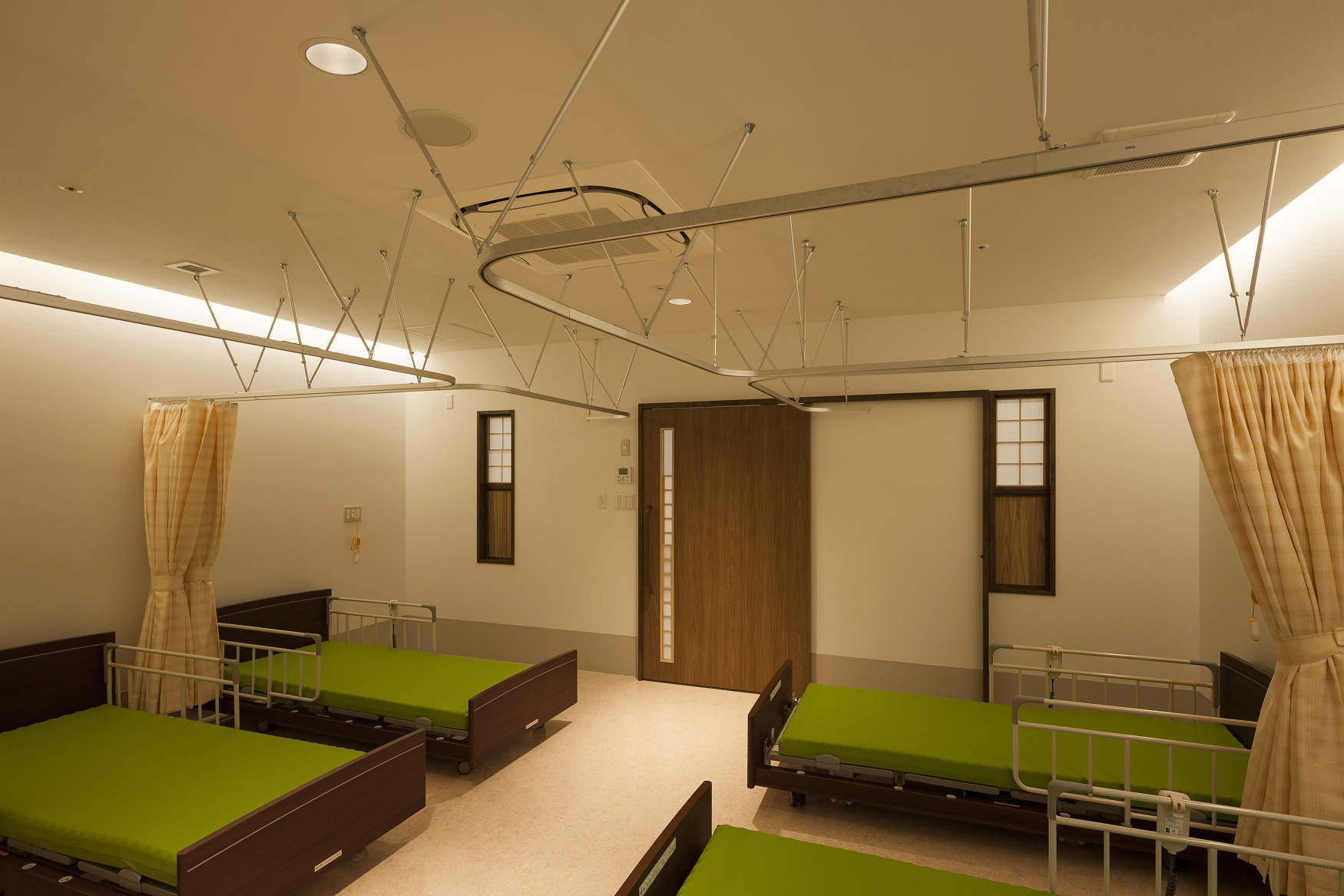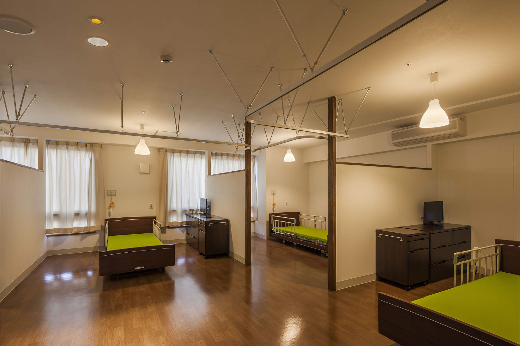 4人室でありながらも個人のプライバシーを確保するため、各々にペンダント照明を計画しました。取付け高さは他のベッドから見えないように設定しています。また、通路には夜間点灯してもベッドから光源が見えないケアサポートライトを採用しています。
