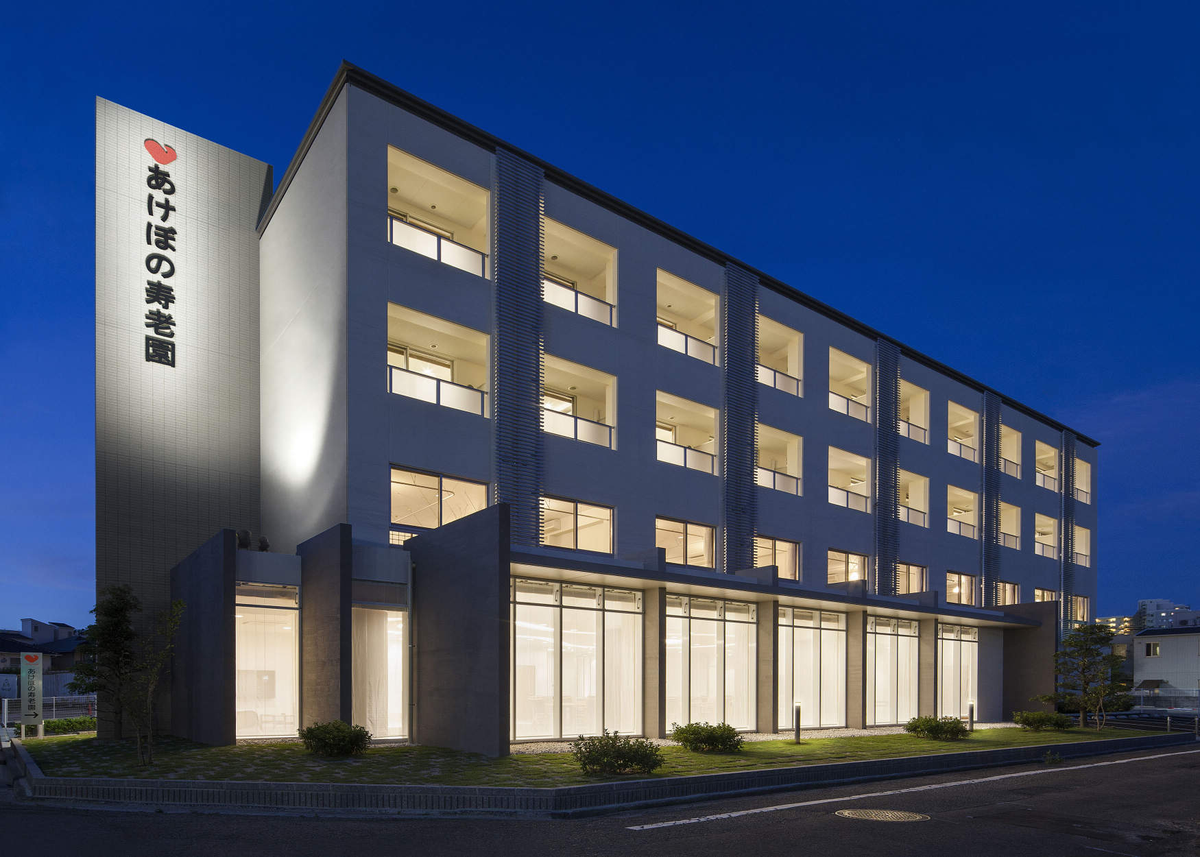 高齢者の在宅福祉支援と居住の場として計画された建物で、1F:デイサービス、2F:ショートステイ、3F、4F:サービス付高齢者住宅の施設で構成されています。